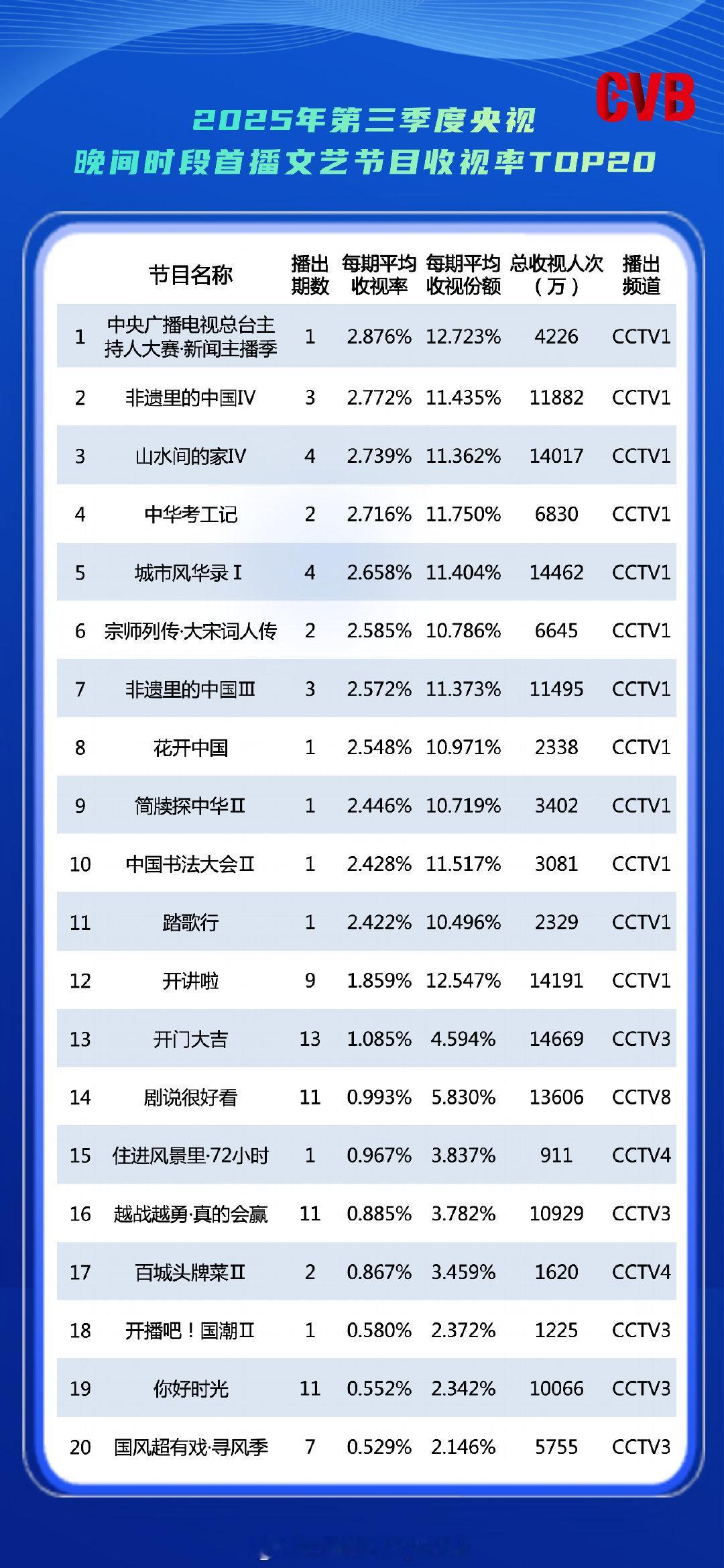 【2025年第三季度中国视听大数据CVB文艺节目收视率TOP20】