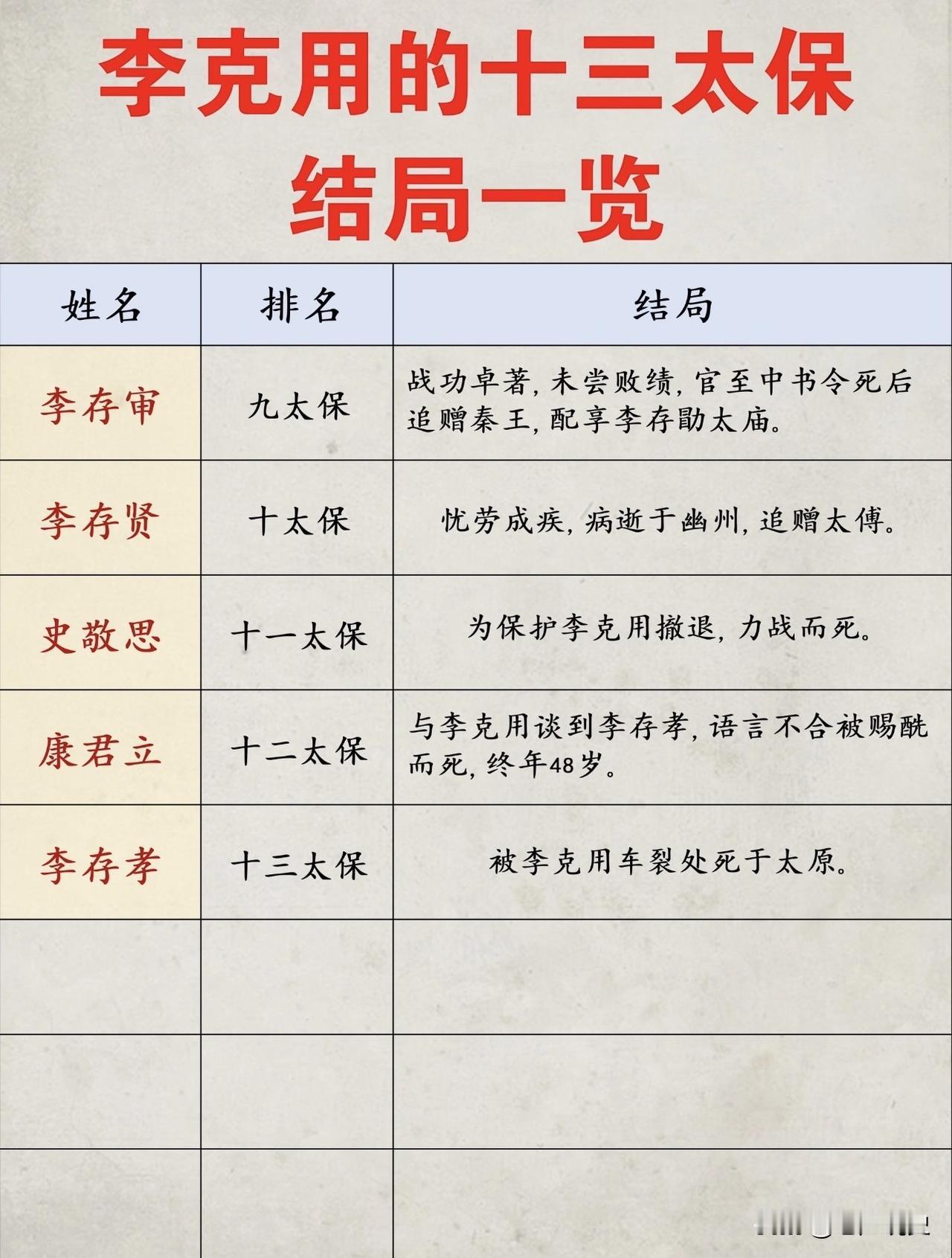 唐末军阀晋王李克用十三太保的结局一览,李克用能在唐末乱世与后梁的朱温争锋,其子李存勖能灭掉后梁建立后唐,离不开李克用的这些义子,即战功卓著的十三太保。三太保李存勖是李克用的儿子,建立了后唐,大太保李嗣源是后唐的第二位皇帝,而十三太保李存孝则是仅次于项羽、吕布一类的猛将,但也死得最惨。 李克用十三太保皆是当时的名将,大部分做到了高官显爵,其中两位还是皇帝,名留唐末五代史册。 历史人物