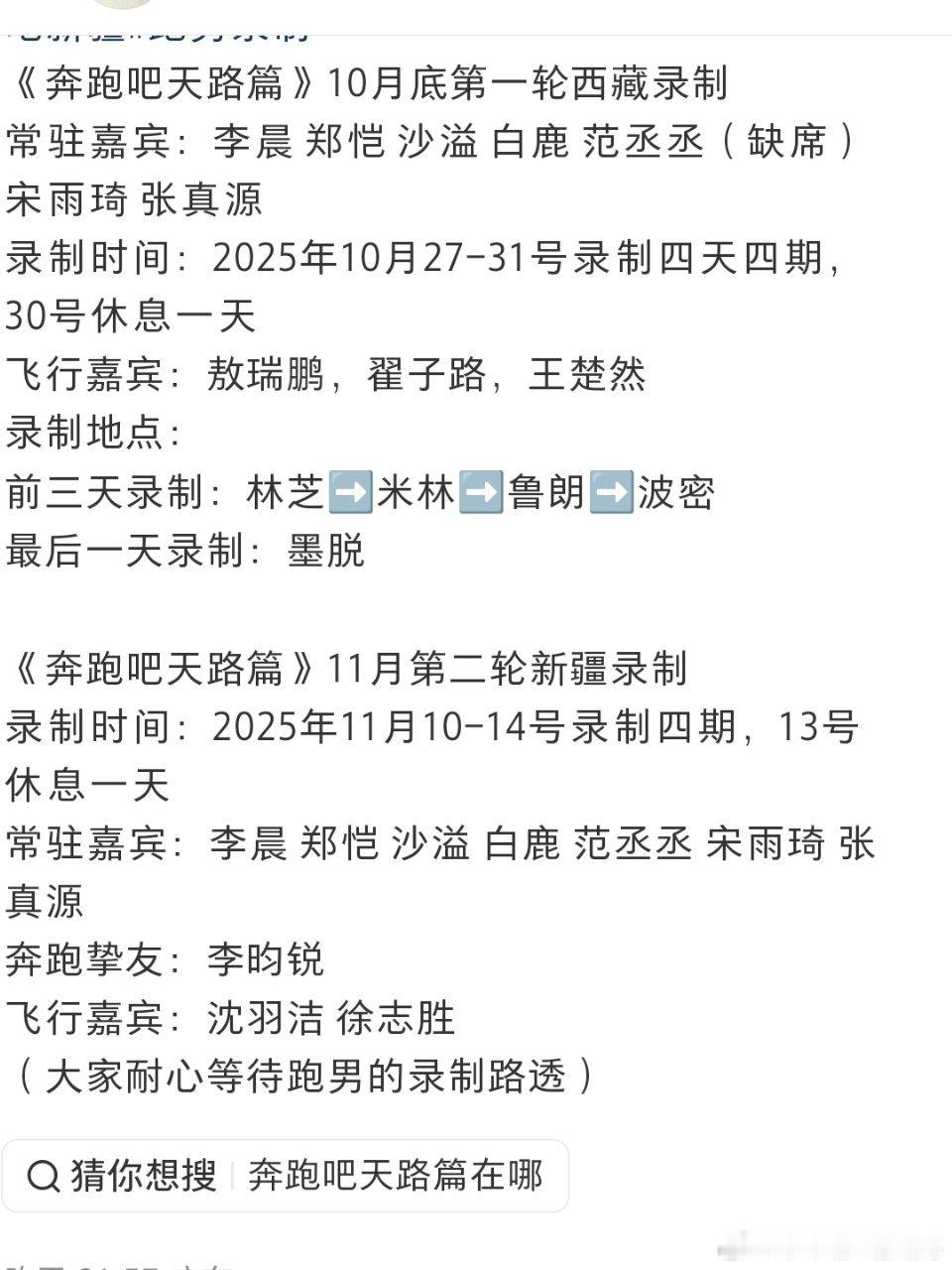 奔跑吧天路篇西藏录制嘉宾阵容及行程