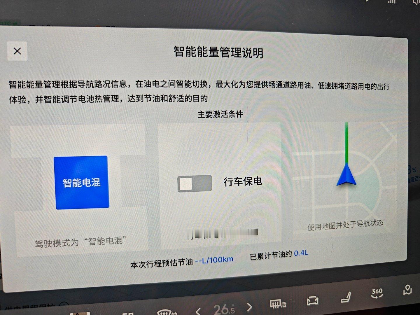 车的状态保持25或26度自动空调+座椅加热+智能电混+智能保电45%(所以这实际上这不是最节能的模式 如图5)
