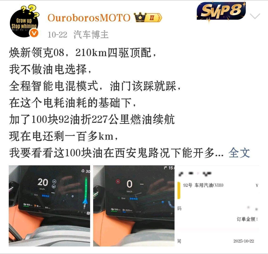 我的02在南昌最好路况下也要7个油[笑cry]差不多6毛一公里,08可是一个4.8米四驱SUV,我觉得足够好了[捂嘴哭]如果你舍不得加油,纯电续航也足够通勤,无非就是经常充电罢了😂