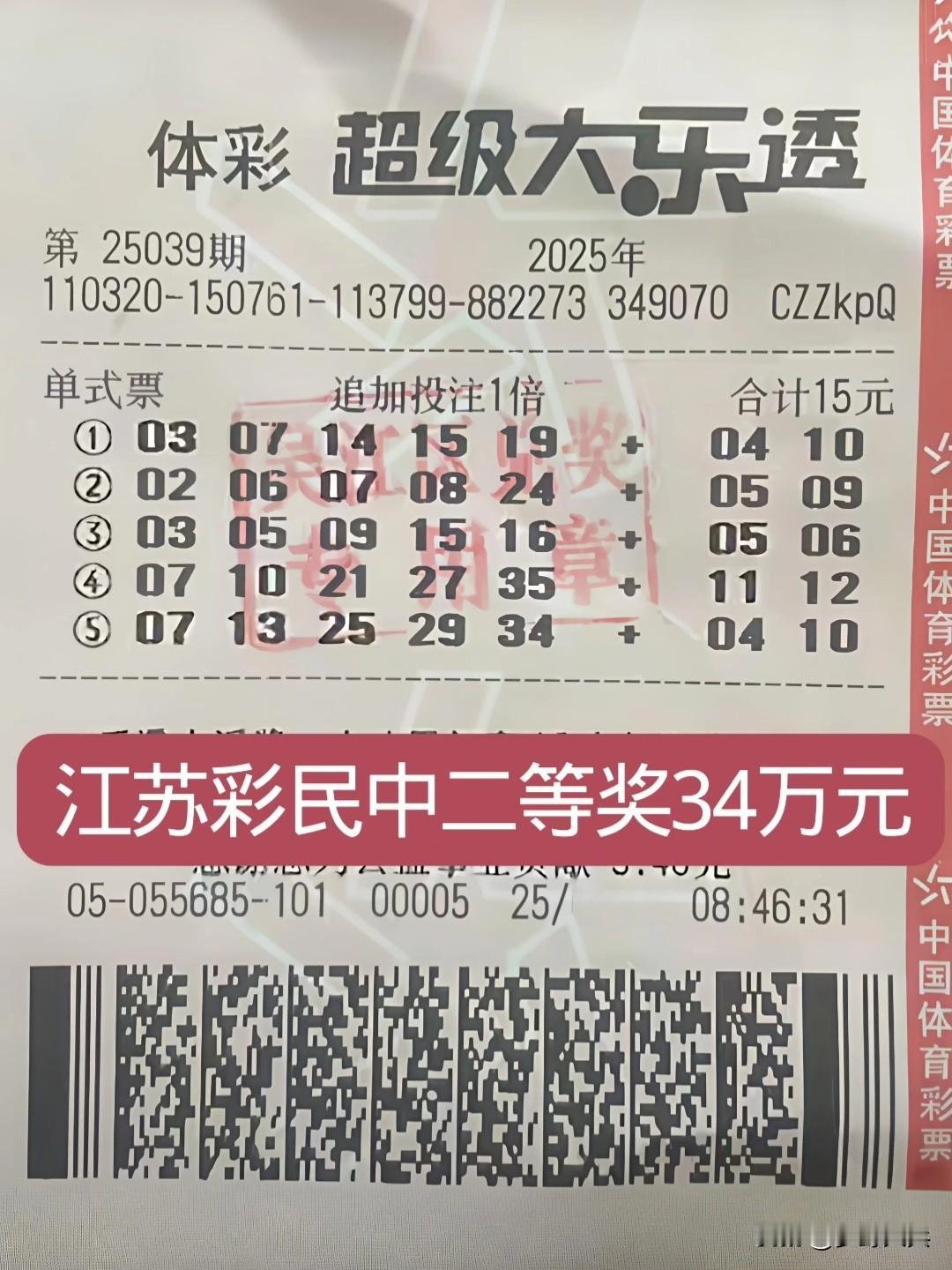 江苏彩民花15元买体育彩票,喜中二等奖34万元,中了注5+1拿下34个W,差一个号码就是一等奖了,离提前退休只一步之遥,差一点实现了财富自由,领了这几十个W奖金可以躺平几年了,15元体育彩票就换来了34万元,这已经是亿万彩民中的幸运者天花板了,太让人羡慕了!