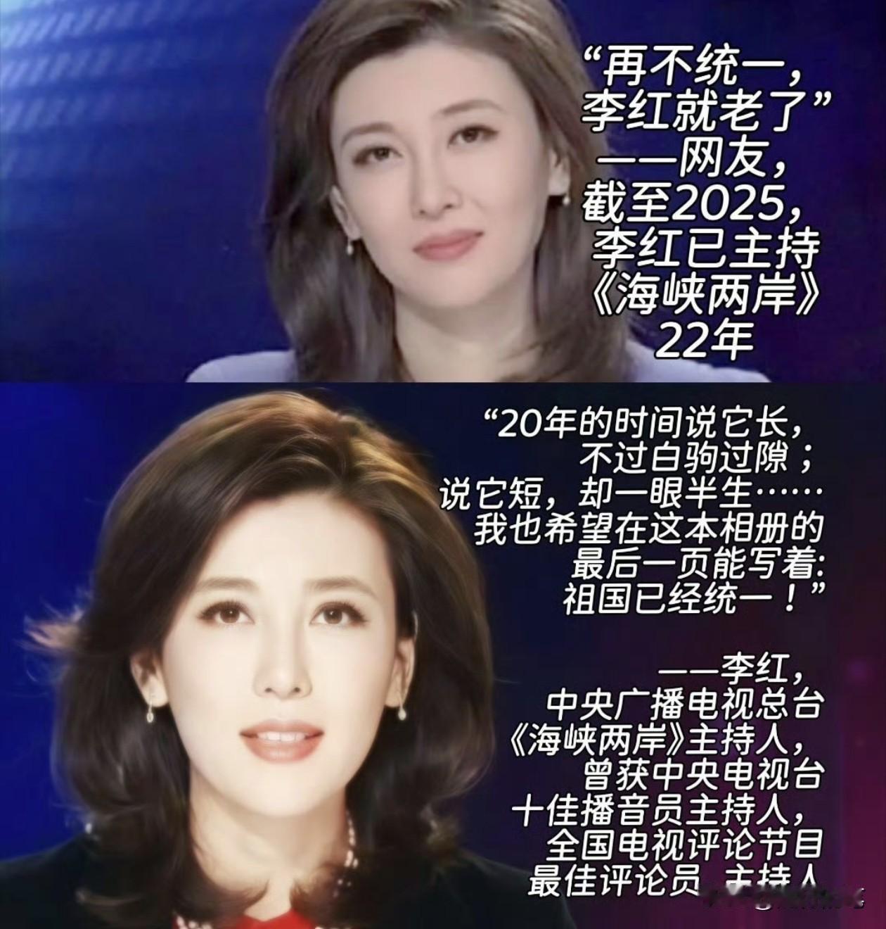 统一那天,央视主持人李红肯定是其中一个最高兴,最感慨万千的人。主持两岸节目《海峡两岸》长达二十多年,见证着两岸交流的更迭与两岸关系的起伏,也从最初了解台湾的先进到现在感受大陆的巨大飞跃进步,统一脚步声越来越近。 主持长达二十多年的综艺节目尚且稀少,更何况是主持一档关于两岸时政节目二十多年呢?这已经不仅仅是热爱,而是刻在骨子里的对祖国统一的真切期盼。