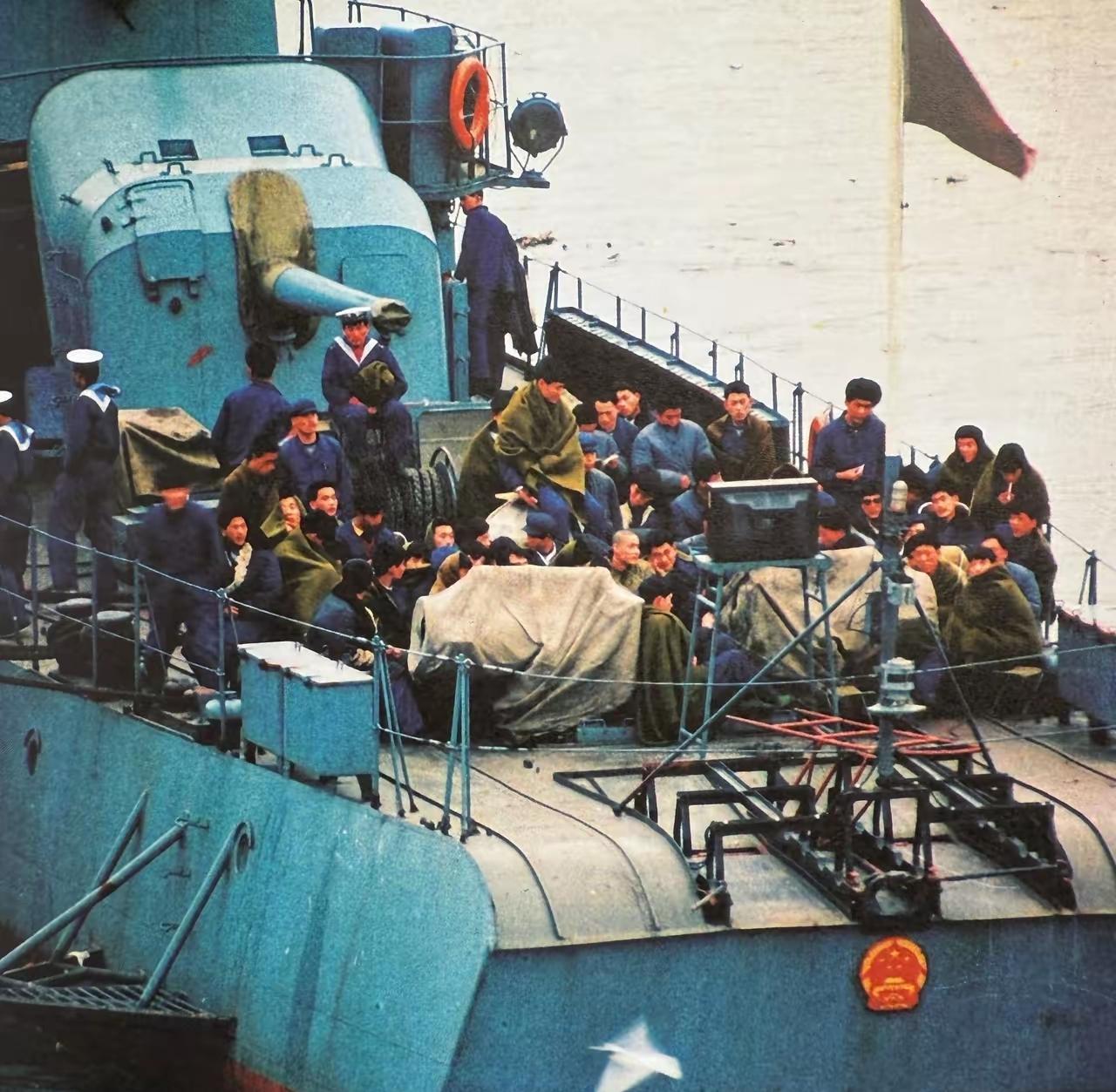 当年人民海军北海舰队装备的“四大金刚”-07型导弹驱逐舰之一。画面显示的应该是官兵们在看电视。在那个时期,这样的场景是经常能见到的。从体量来看,大概是21寸的电视,或者是更大一些的。从画面中有人还裹着毯子的情况来看,时间应该是进入冬季了。为什么不到会议室去看呢?由于要是接收无线信号,所以电视机放在军舰的甲板上信号会好一些。 当时这“四大金刚”101~104舰均隶属北海舰队驱逐舰第1支队,常驻青岛大港。所以这个场景大概率是在青岛大港码头拍摄的。 现在的101~104舰已经是055大型导弹驱逐舰了。如果有网友对画面中老的四大金刚感兴趣,可以到青岛的海军博物馆一睹其真容。据说那条舰是保存的最完整的。 老的“四大金刚”现状如下: 鞍山舰(101), 1992年 停泊于山东青岛海军博物馆展展出 。 抚顺舰(102), 1989年 退役,被拆解。 长春舰(103), 1990年 停泊于山东乳山市银滩供人参观 。 太原舰(104), 1991年 停泊于辽宁大连老虎滩,作为练习舰/博物馆舰。