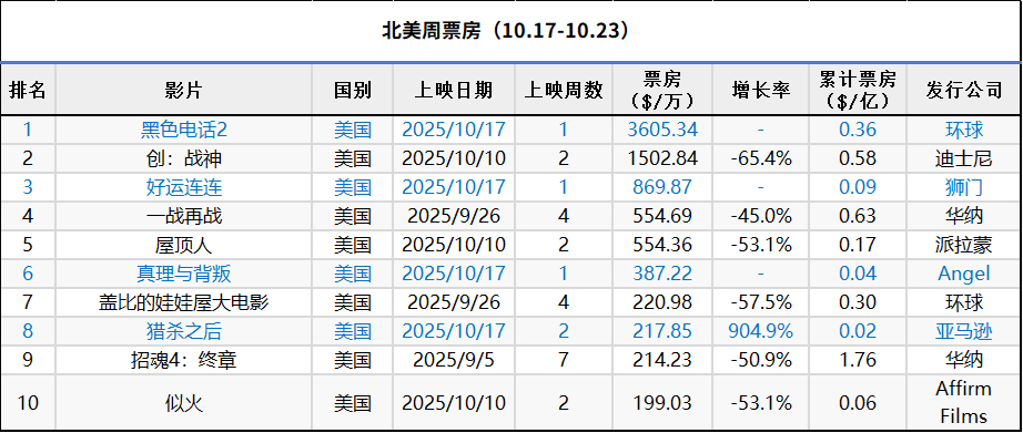 1. 环球恐怖片《黑色电话2》开画夺冠,与前作水平相当;