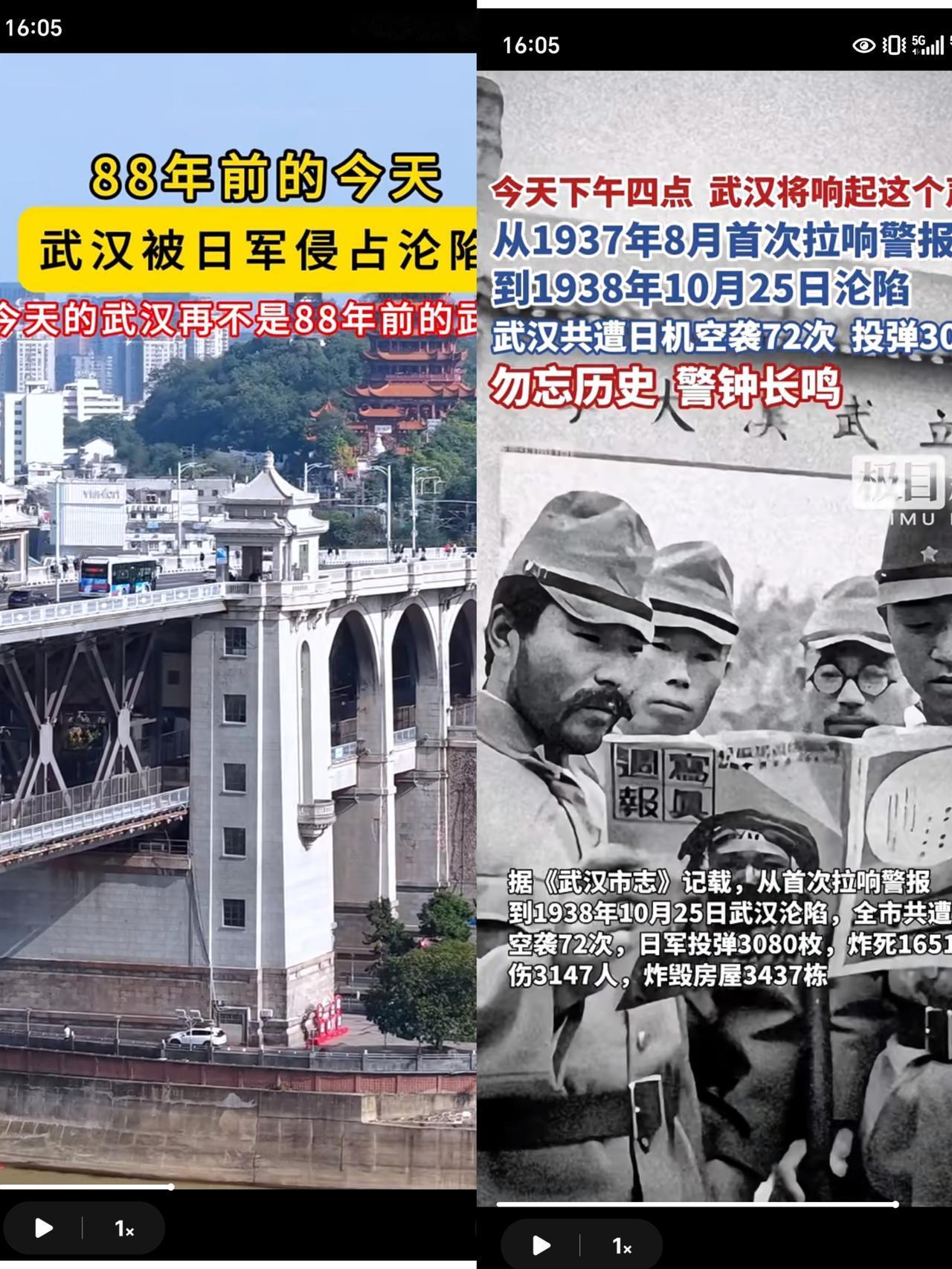 88年前的今天! 武汉被日军侵占沦陷! 今天武汉上空的防空警报,不是警报是警钟! 今早武汉拉防空警报时,我正在路口等红灯,尖锐的声音突然划破天空,身边行人都下意识停下脚步。一开始还愣了下,翻了日历才想起,今天是武汉“防空警报试鸣日”——每年10月25日,都是为了纪念1938年武汉沦陷,也提醒我们别忘那段历史。 不是真有危险,却是最该认真听的声音。80多年前,这座城市曾在炮火里挣扎,如今警报响起,是让我们记得:现在的平安不是凭空来的,是前人扛着苦难换来的。刚才看到有家长指着天空,给孩子讲警报的意义,突然觉得特别好——不是要传递恐惧,是要让每个武汉人都记得根、守着魂。 试鸣只有几分钟,但心里的震动会留很久。愿我们都能听懂这声警报里的重量:不忘过去,才能护好现在的烟火气。