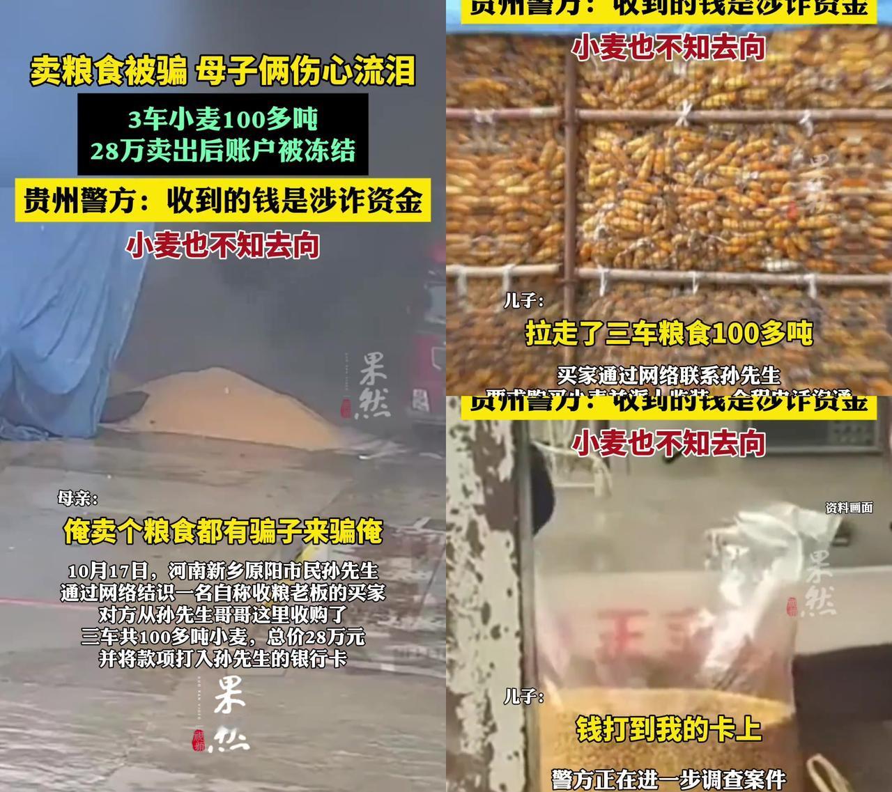 河南新乡的粮库门口,孙大哥蹲在地上抽闷烟,母亲攥着没热透的馒头抹眼泪:“俺们凌晨3点起的床,装了100吨小麦,咋就成骗子的洗钱工具了?” 通过网络找的收粮老板,派了人监装,拉走三车小麦,28万刚打进银行卡,买家就失联了,贵州警方说,这钱是涉诈资金,卡被冻了。 大家都憋着火:“为啥骗子的钱在自己账户没冻,一到农民手里就秒锁?卖个粮食咋成‘帮凶’?” 警方并非针对,而是资金流到下游账户才触发预警,但大伙气的是,咋不早拦骗子,让农民别踩这坑? 100吨小麦是母子大半年的收成,种时怕旱怕涝,卖时怕压价,结果栽在看似靠谱的收粮单上。 有人说“微信电话都是实名,咋查不到骗子?”也有人问“冻了钱,那被拉走的小麦能找回来吗?” 农民的汗珠子,不该白掉啊!大家觉得这事最该查的是啥?