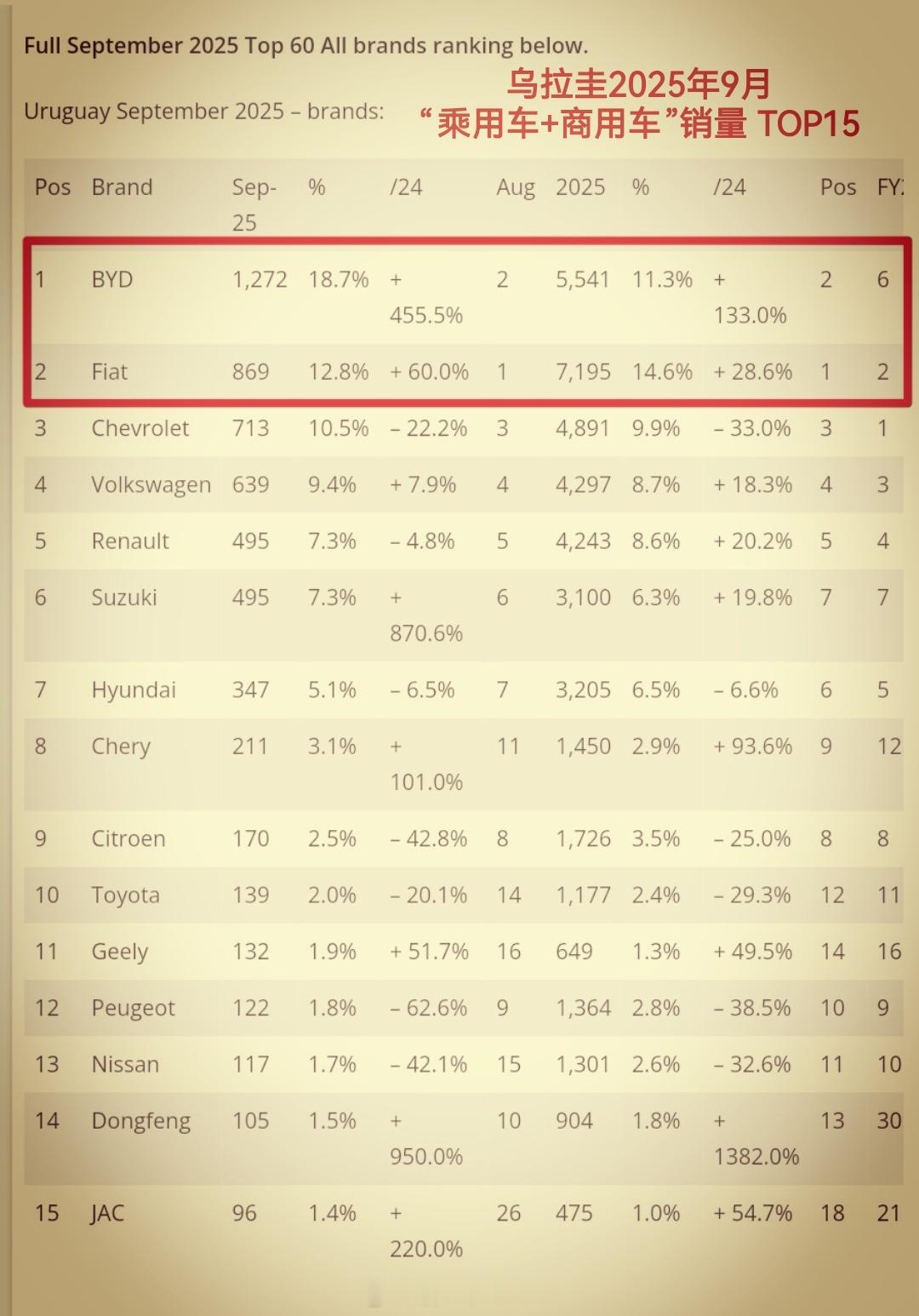 1-9月,比亚迪乌拉圭累计销量5541台,本年度销量坐二望一(第一名菲亚特7195台)!