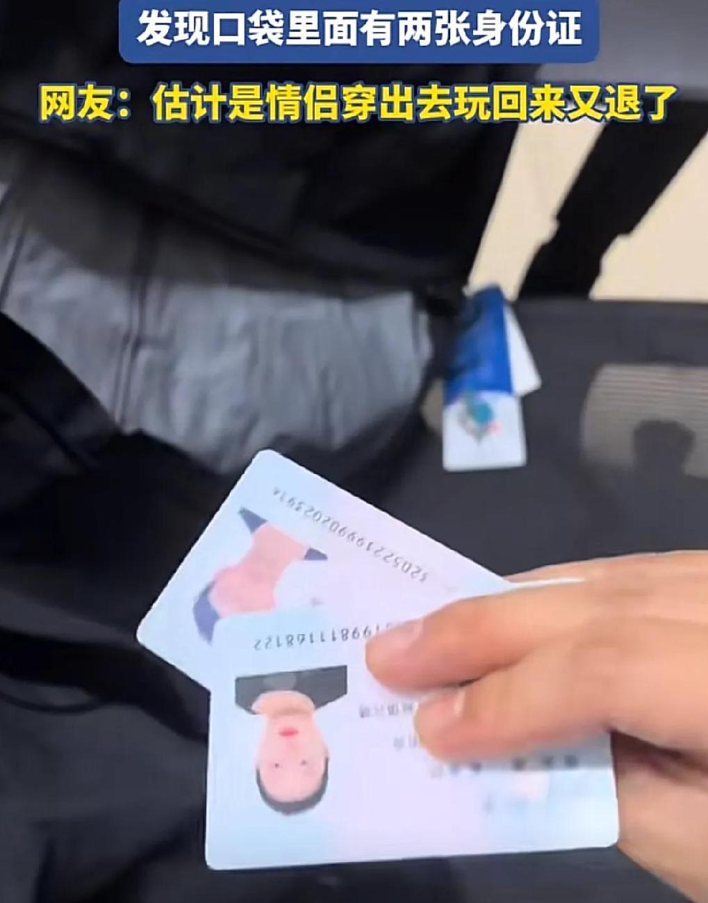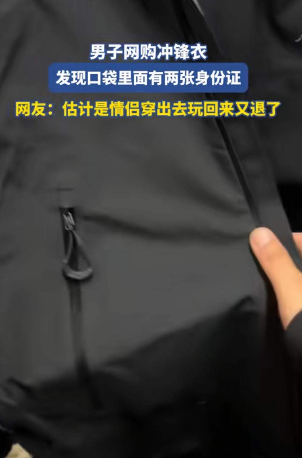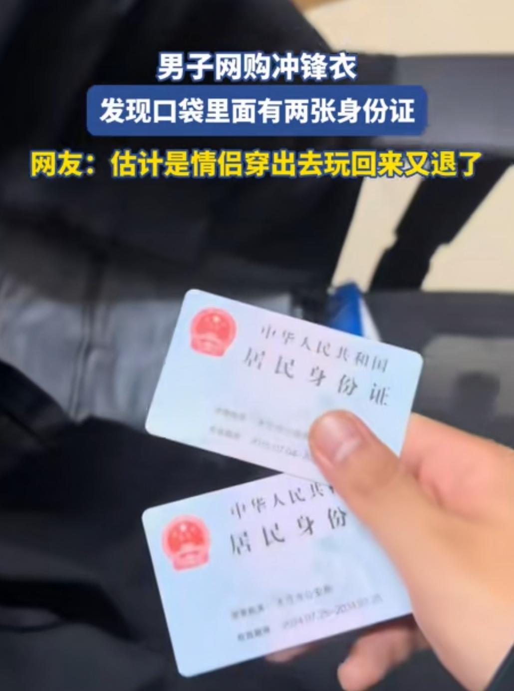 一件衣服引出来的“大瓜”! 一位网友网购了一件冲锋衣,打开包装却从衣服口袋翻出来了两张身份证,于是拍了个视频吐槽商家。 懂得都懂,这件衣服很可能是被人“七天无理由退货”给白嫖了,商家没仔细检查,重新包装又发货。 问题就出在这网友无意把身份证展示了一下,也就1秒不到的工夫,于是就有手速极快的网友给截了下来。 隐约可以看到,身份证是320开头,被扒出是江苏太仓人,头像一男一女,女的98年11月6日,男的99年2月2日。 于是网友纷纷化身“福尔摩斯”,说深挖一下两人,看看是不是情侣,两人做了什么,身份证为何出现在同一个口袋。 大家的关注点应该是商家,现在却把这两人的热度炒得很高,当事男女最好希望这视频不要火,最好是合法的,不然后续的“瓜”不堪设想! 网购衣服踩坑 退货衣服