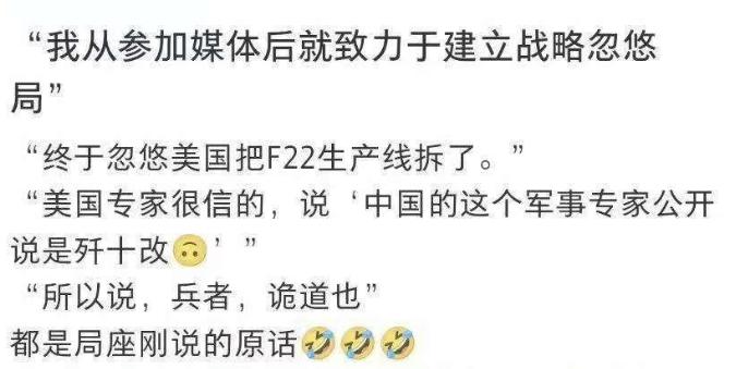 原来,战忽局是真的。 以前,一直以为,战忽局只是网友口中的调侃。 直到,局座自己在座谈中亲自承认。 全世界的网友都知道,西方的舆论战很厉害,没想到,我们是以其人之道还治其人之身。 这一招太绝了。 现在美国要重建F-22的生产线,是没有任何可能了。