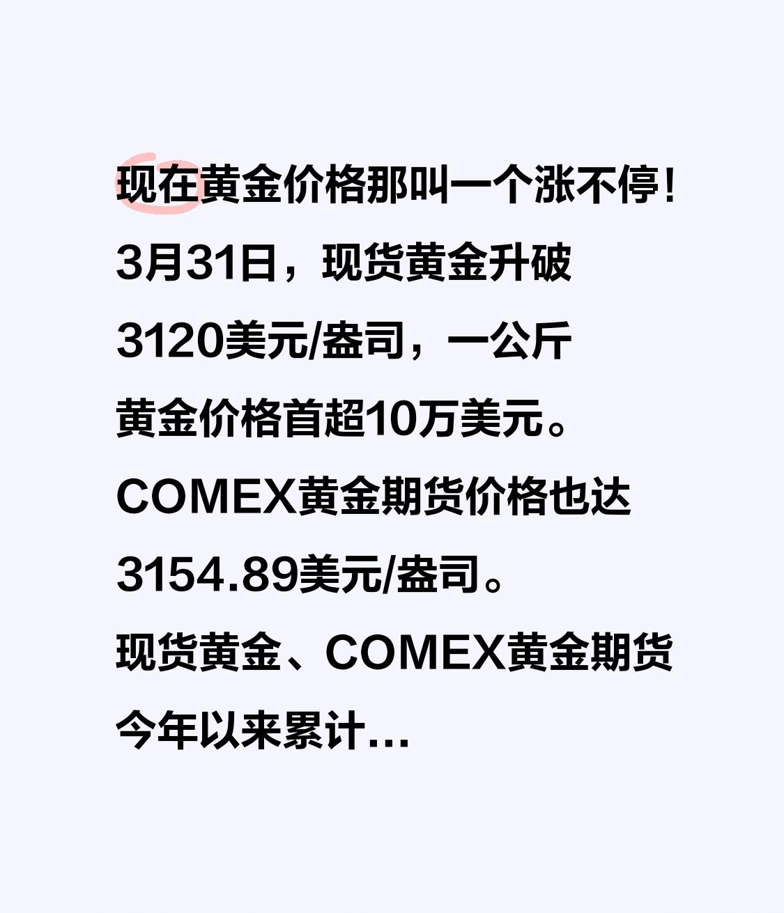 现在黄金价格那叫一个涨不停!3月31日,现货黄金升破3120美元/盎司,一公斤黄金价格首超10万美元。COMEX黄金期货价格也达3154.89美元/盎司。现货黄金、COMEX黄金期货今年以来累计涨幅均超18%。 国内市场也受影响,多家黄金珠宝品牌金饰价突破935元/克,如周大福足金936元/克。部分投资金条价格接近740元/克,工商银行部分金条达738.45元/克。上期所沪金期货主力合约也创新高。这黄金价格一路飙升,不知道现在还适不适合上车呢。