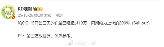 1、第三方数据显示iQOO 15首销三天卖了13万台以上,同比约为iQOO 13的200%。翻译:同比增长100%,销量翻了一倍;