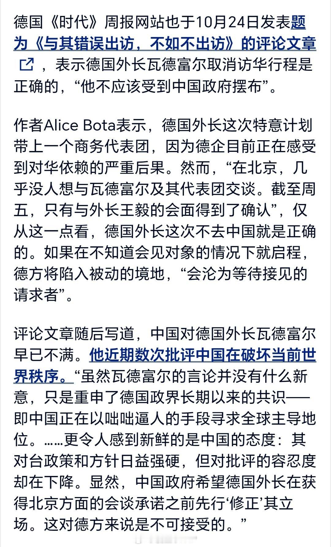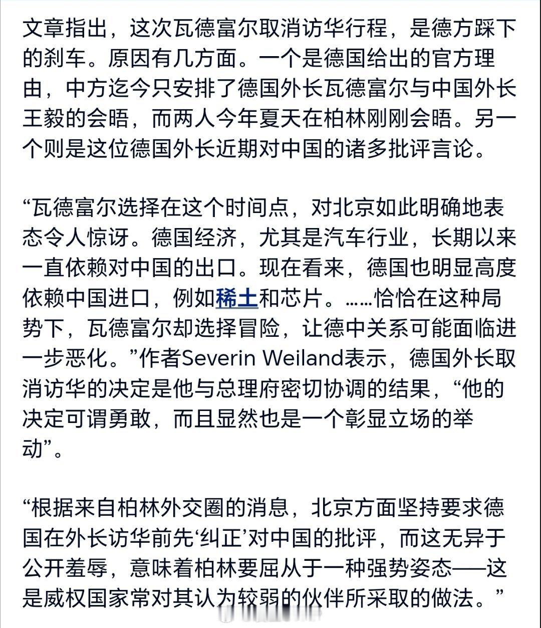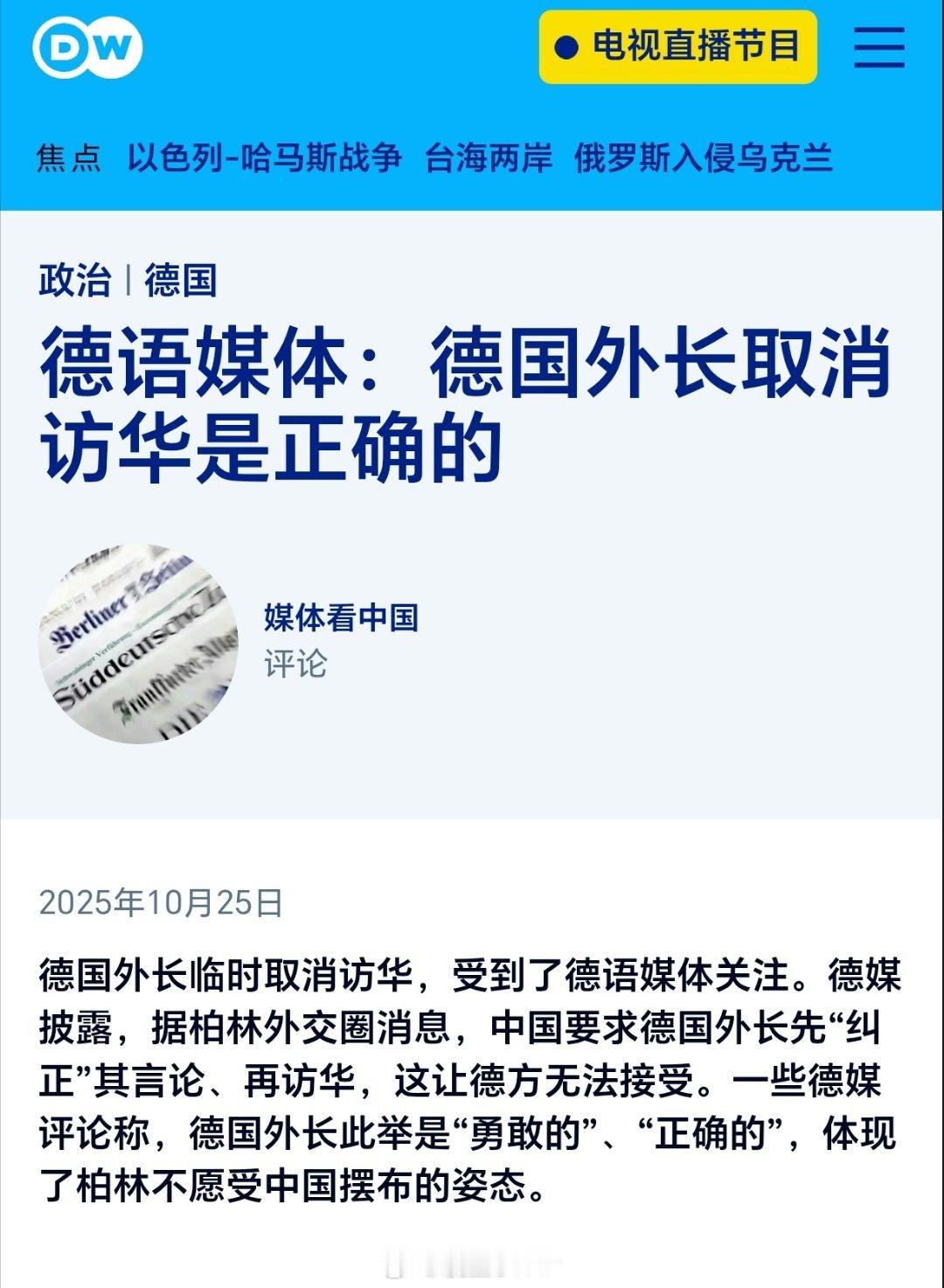 德国外长访华计划推迟德国之声:德国外长临时取消访华,受到了德语媒体关注。德媒披露,据柏林外交圈消息,中国要求德国外长先“纠正”其言论、再访华,这让德方无法接受。