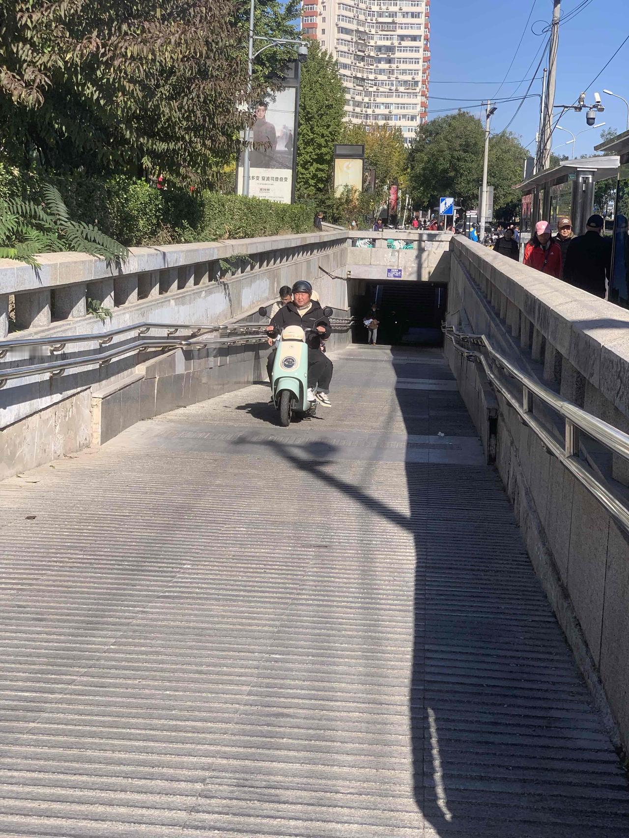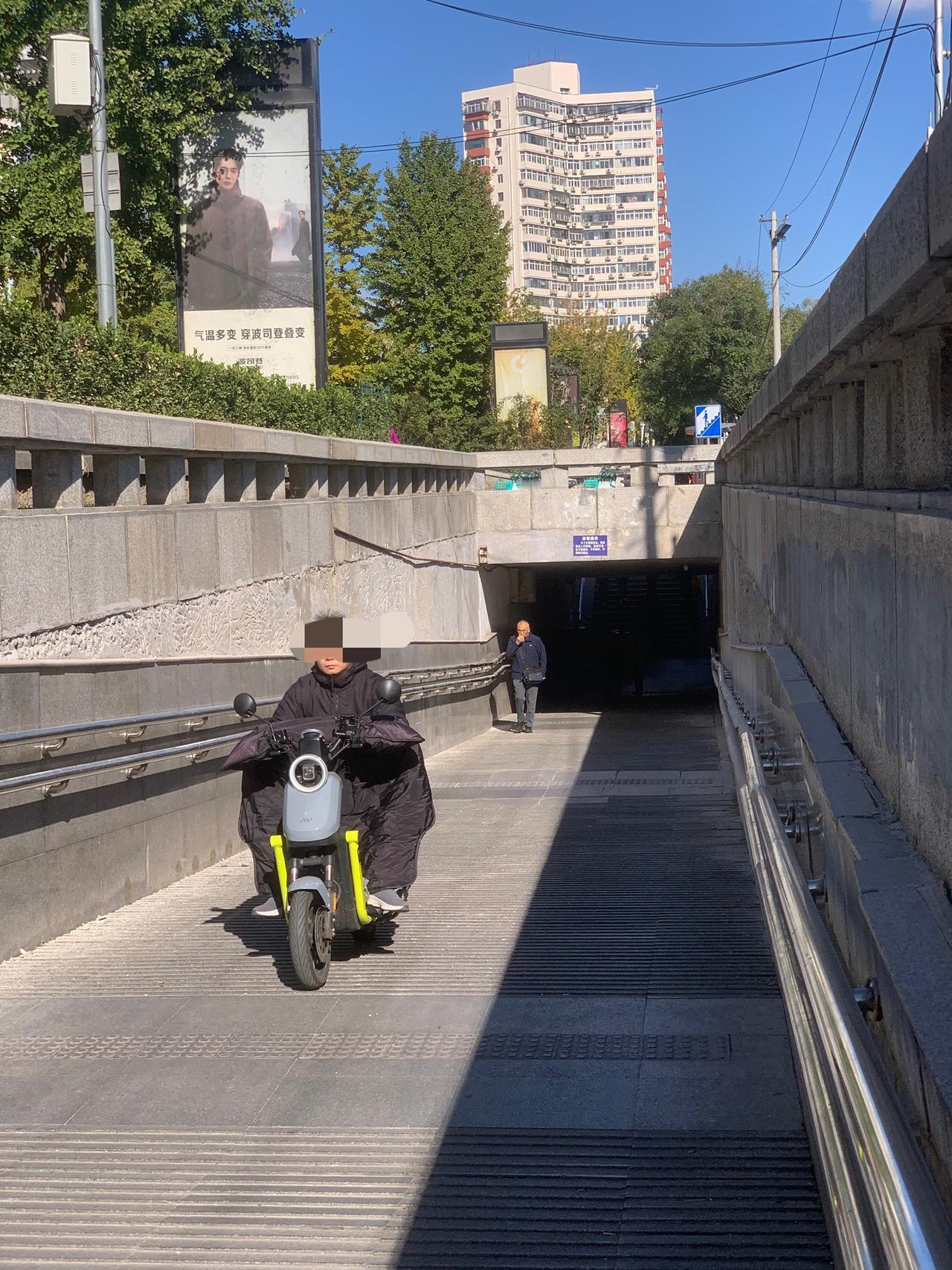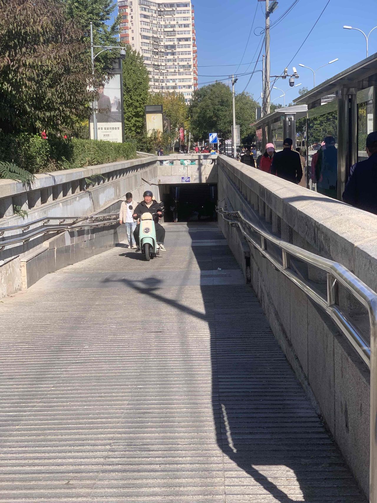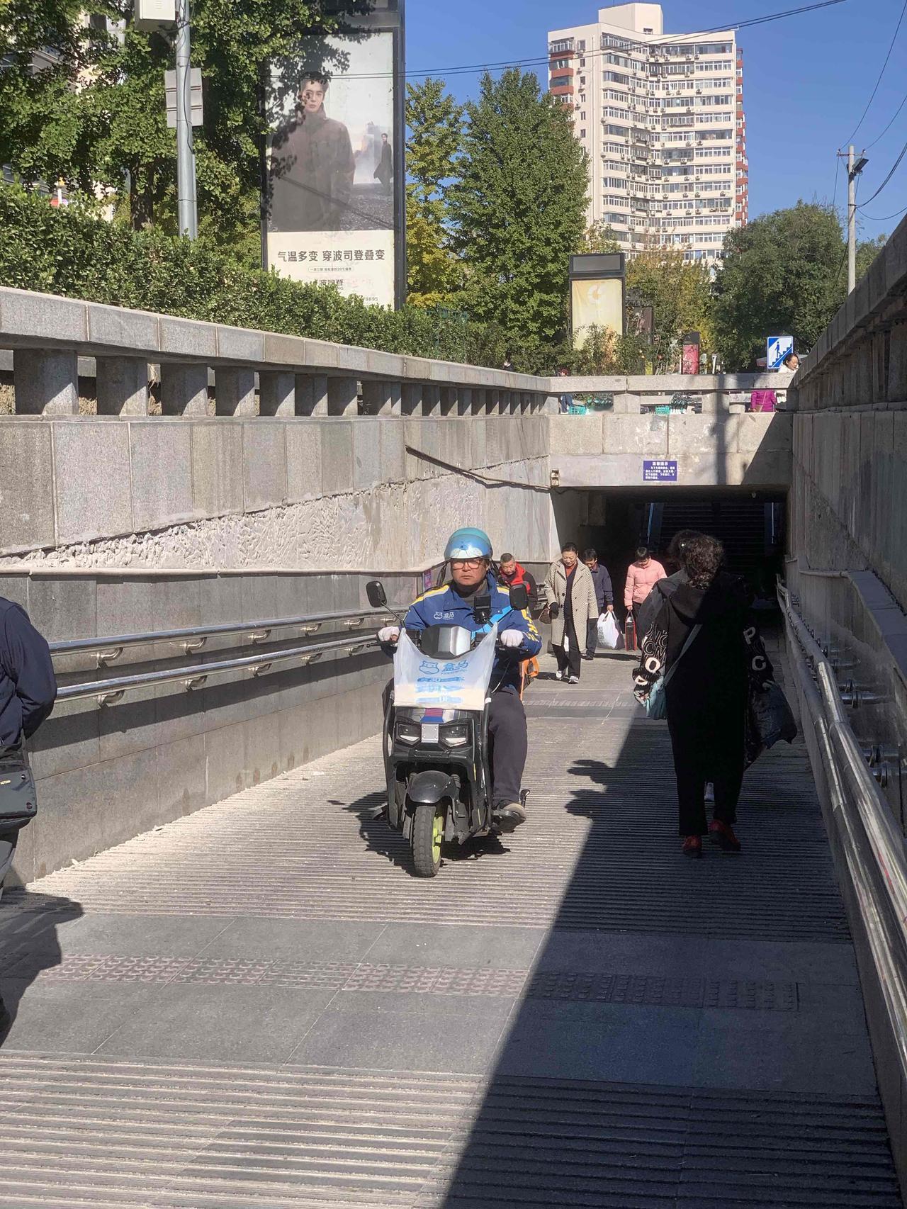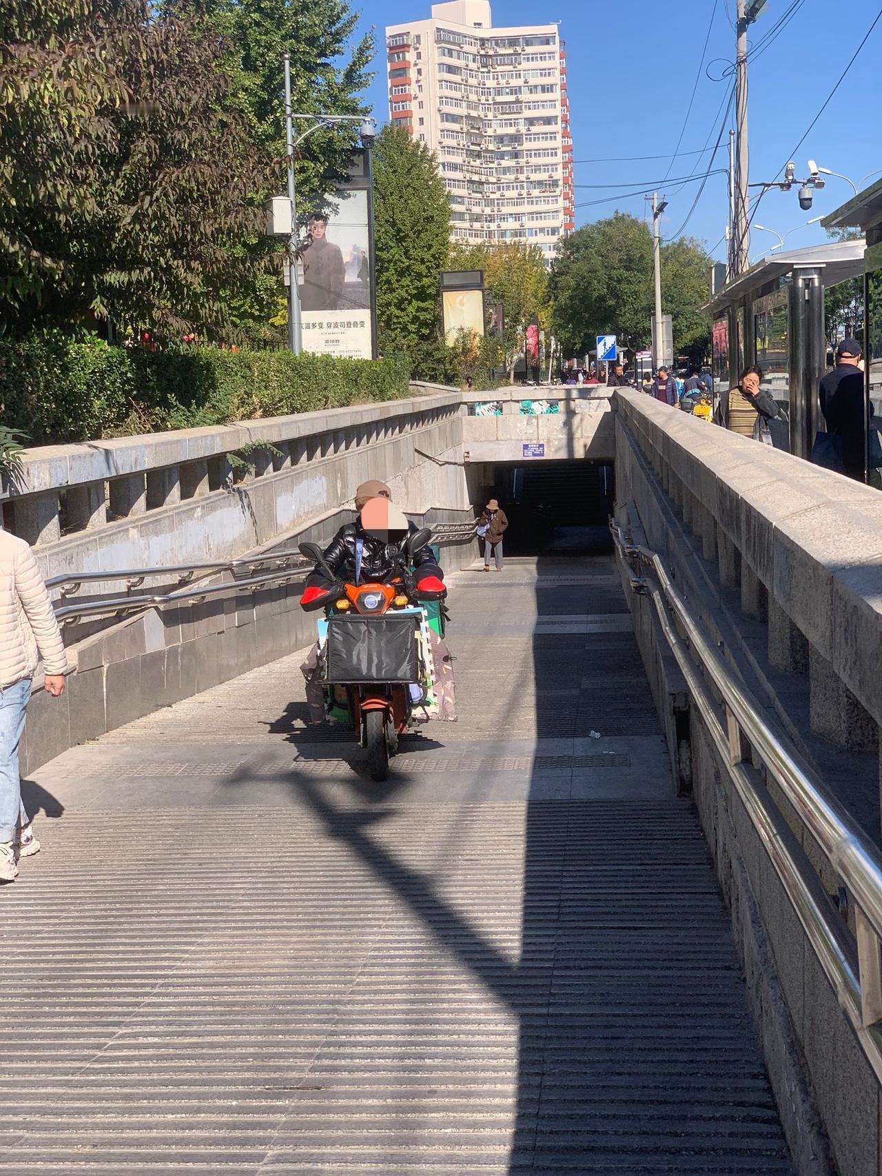 北京百荣世贸商城前,地下通道入口处,明明有禁止电动车穿行的牌子,这些人却视而不见,大摇大摆地骑行,是不是素质太差了?对这些人应该予以重罚,每次罚款500元,估计他们就不敢了。 还有就是,过街天桥上,每天都能看到送外卖的,骑着电动车横冲直撞,威胁路人安全。 对这些人应该怎么办呢?
