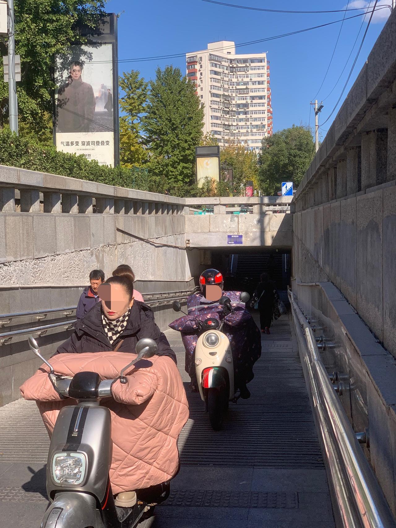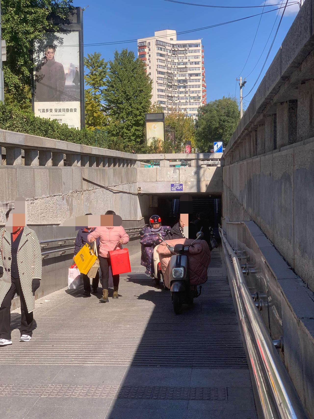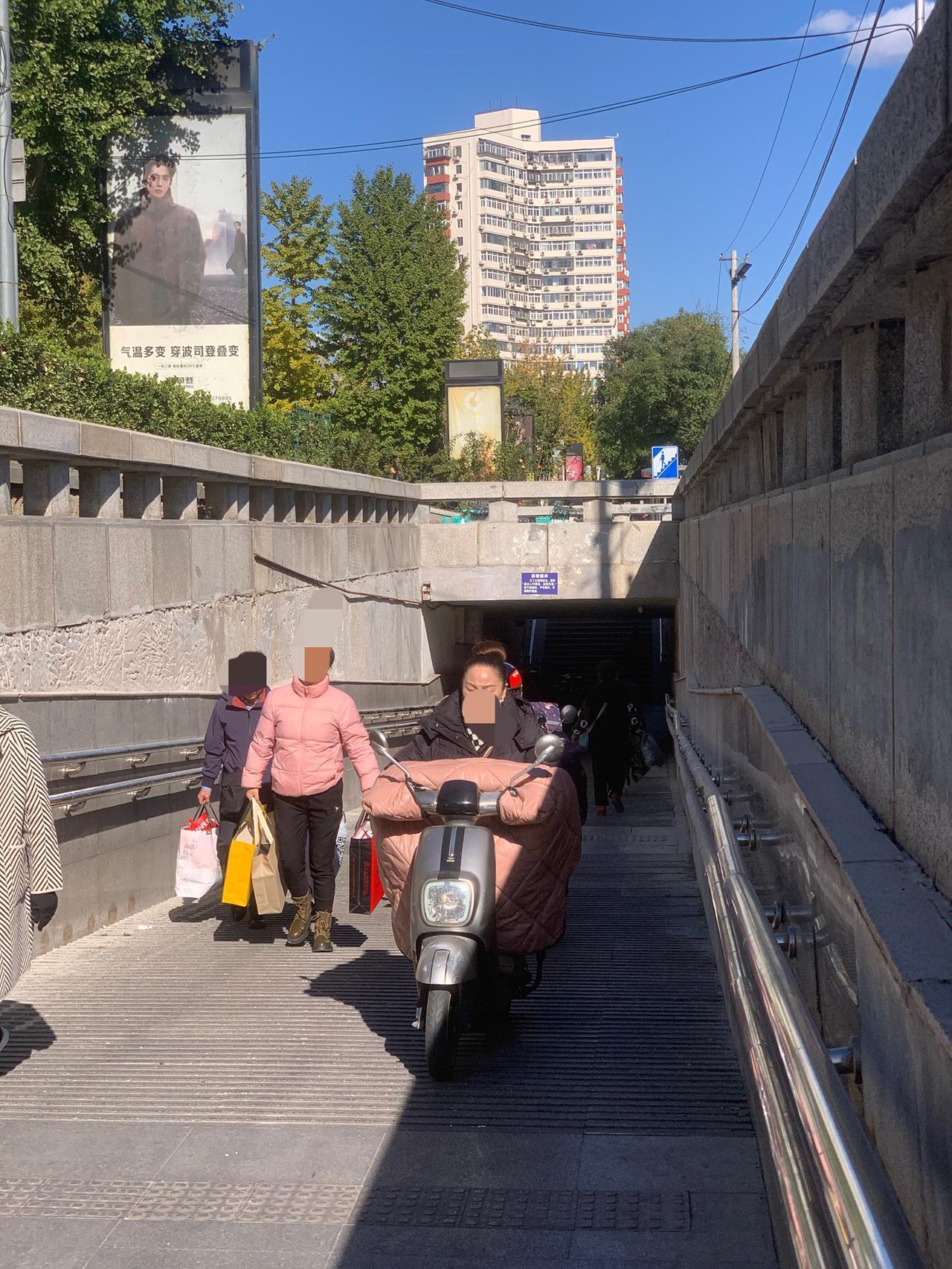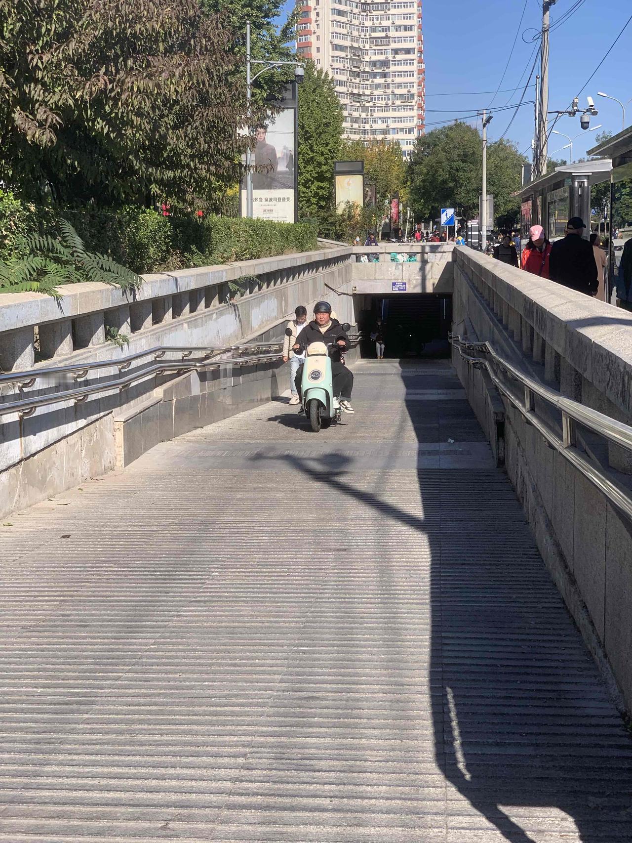 北京百荣世贸商城前,地下通道入口处,明明有禁止电动车穿行的牌子,这些人却视而不见,大摇大摆地骑行,是不是素质太差了?对这些人应该予以重罚,每次罚款500元,估计他们就不敢了。 还有就是,过街天桥上,每天都能看到送外卖的,骑着电动车横冲直撞,威胁路人安全。 对这些人应该怎么办呢?