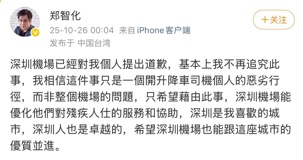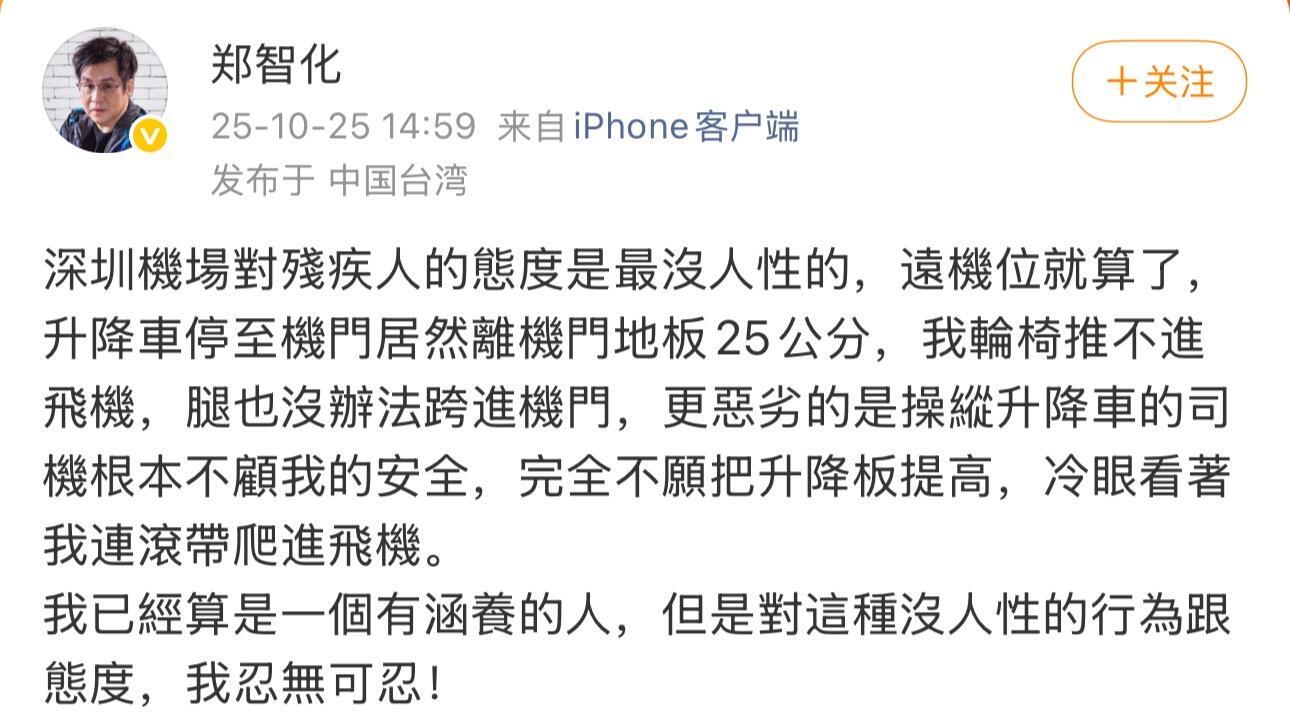 10月25日深夜,深圳机场发布通报称,对郑智化反映的情况,机场高度重视,联合航空公司对现场保障情况快速进行了核实: