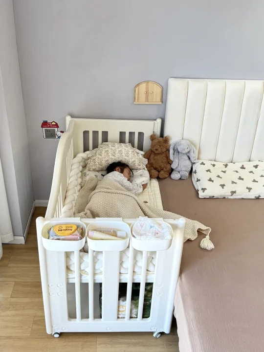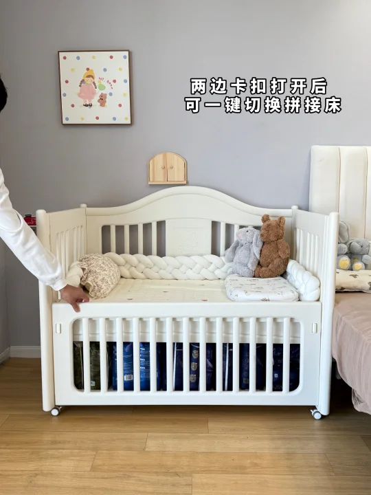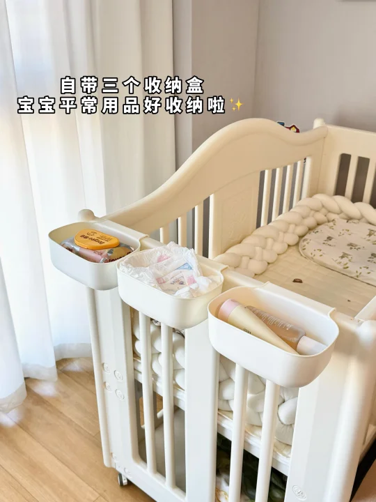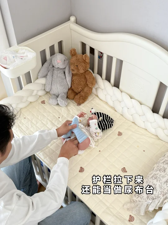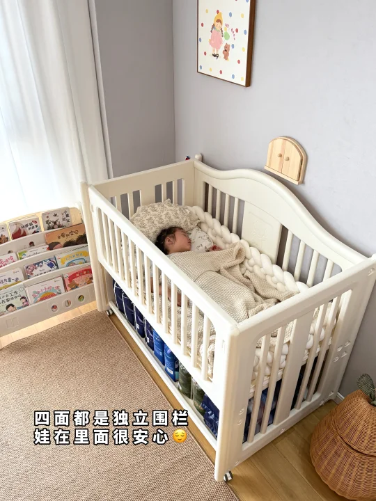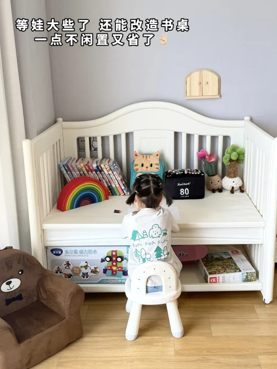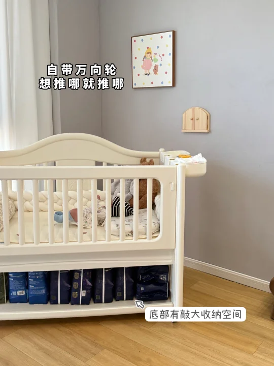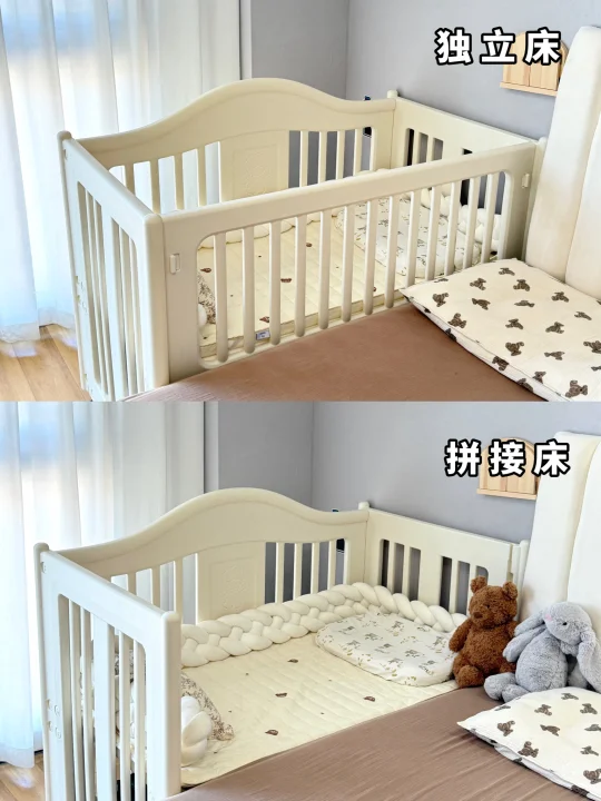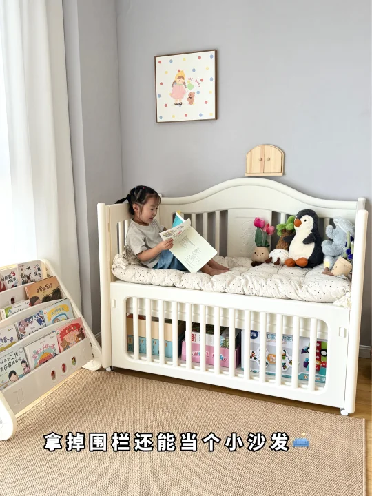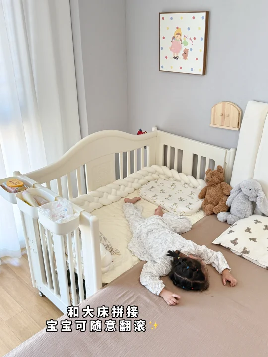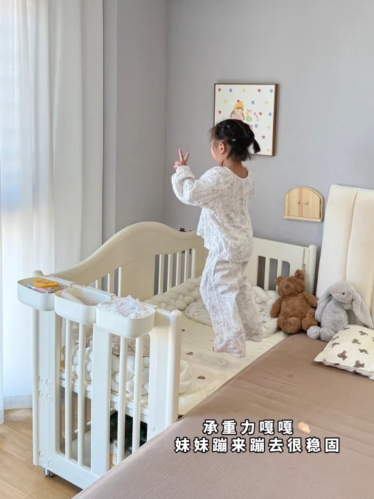 摊牌了!精简带娃的好手! 就是介个babyviva的婴儿床 不止是婴儿床,它还是拼接床、游戏围栏、书桌 真可以从小用到大,一点不闲置😊 它的侧边围栏是可以升降的↕️ 根据需求可以随意切换婴儿床和拼接床 还自带了万向轮 走哪推哪真的很方便 稳定性也没得说 yuyu在上面蹦蹦跳跳都没问题😁 就算娃大了还能改造成游戏围栏或沙发床 实用性杠杠的~👏🏻 冤枉钱是一点没白花 还在做婴儿床攻略的麻麻们可以放心冲!