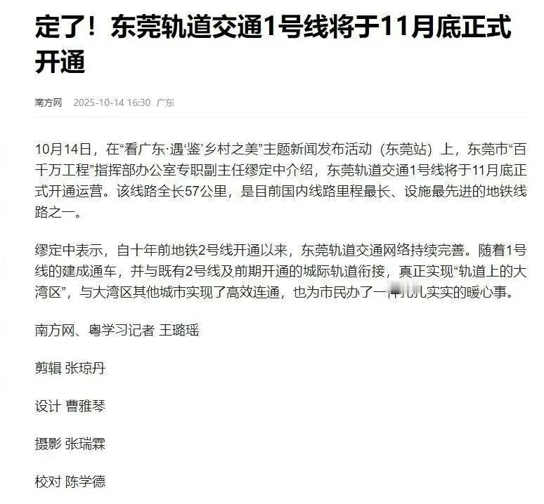 终于等到了,东莞地铁1号线预计11月底正式开通!实现水乡片区、东莞城区、松山湖片区之间的互联互通。 该线路途径望牛墩、洪梅、道滘、万江、南城、东城、大岭山、松山湖、大朗、黄江等地,全长约57公里,全长票价约11元。