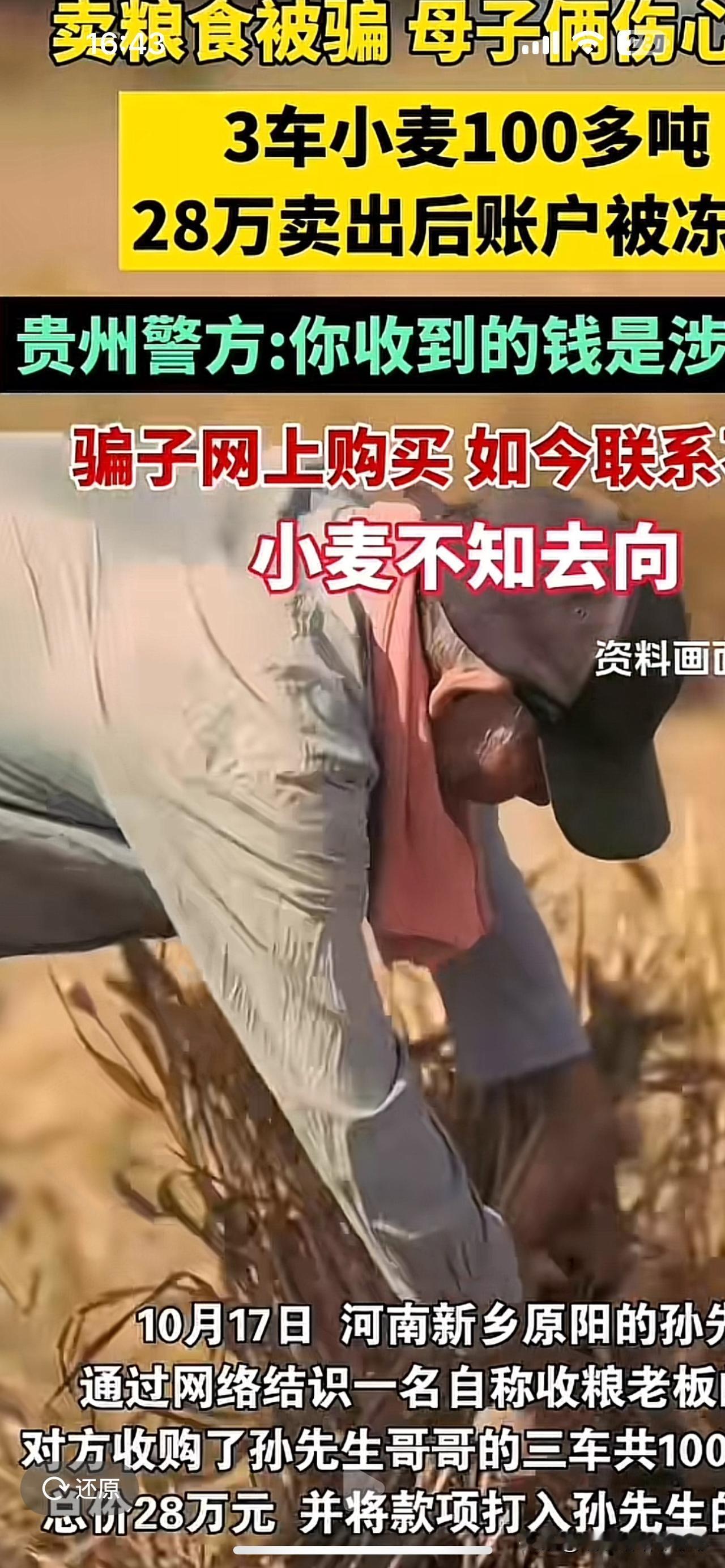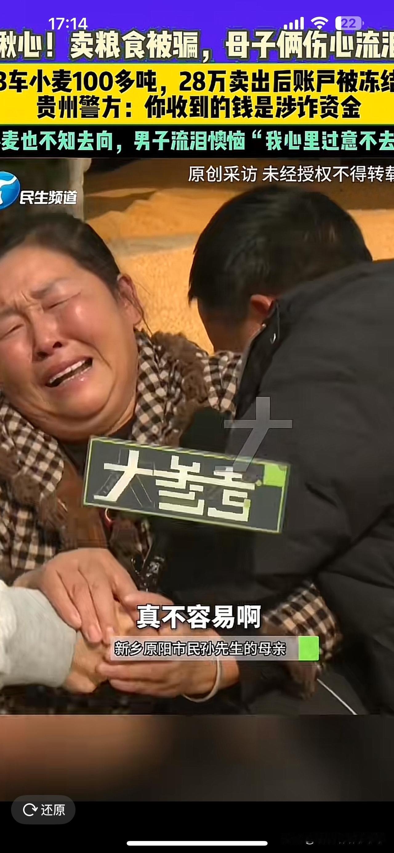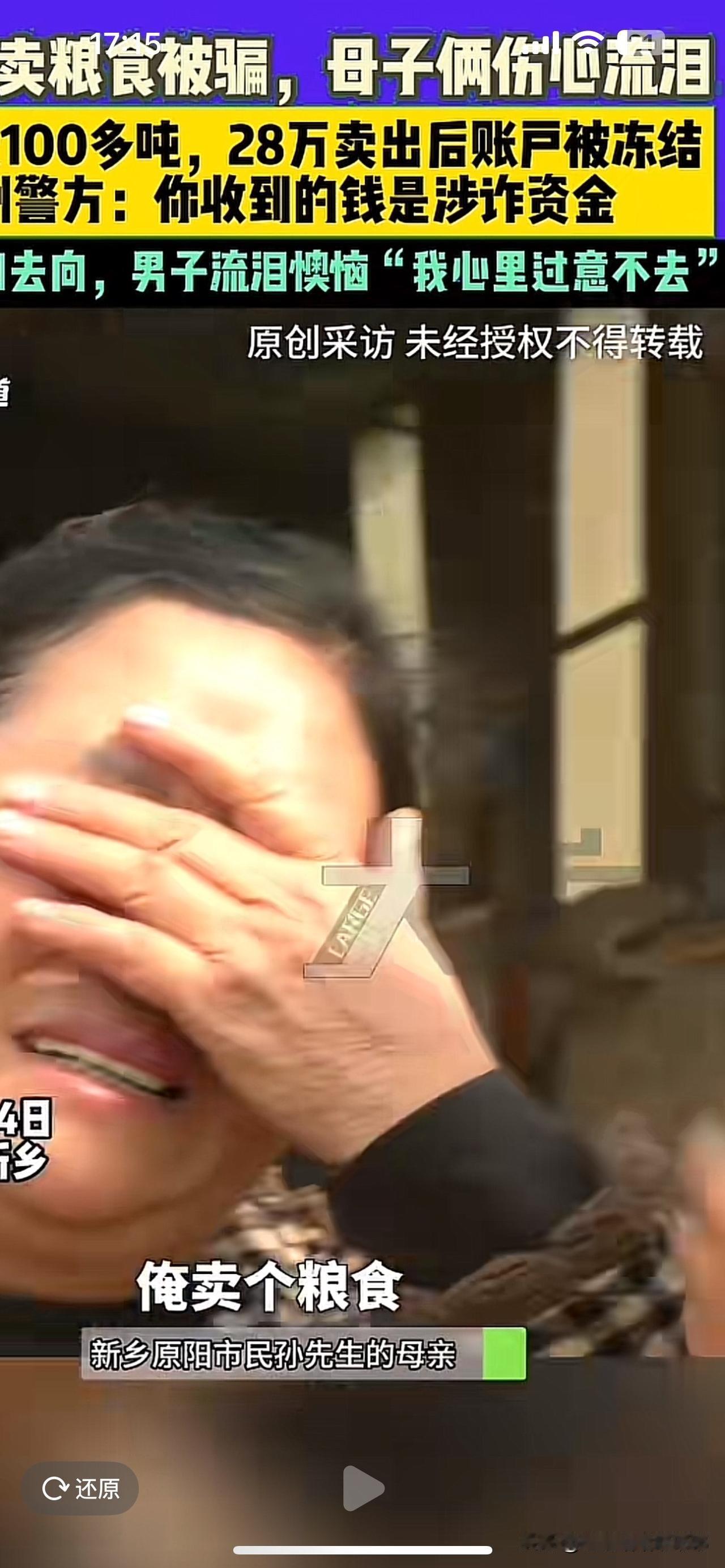 谁也想不到100多吨小麦,辛辛苦苦的一袋袋装车,28万元到账两天就被警方冻结了! 河南新乡这对母子真的是被捅了心窝子,一个老百姓老实人做着老实事最后赔了货银行卡被封,全家陷入了困境 孙先生做的是粮食销售生意前些日子一个自称是收购老板的陌生人通过网络联系到他,说要高价收小麦,而且非常着急,男子寻思能赚点是一点就把这个消息告诉了他的哥哥,他们感觉价格合适,答应把小麦卖了 很快三车小麦一百吨全部拉走,买家那是一个痛快直接搭款28万到账,母亲开心的想把这笔钱买点农具,并且还能还上借的贷款,全家人都以为今年的冬天可以踏踏实实的过冬天 可是仅仅过了两天就被警方来电说这笔钱涉诈金额,原来那个所谓的粮商原来是洗钱团伙的,而那二十八万是电信诈骗来的赃款,听到这个噩耗 母子撕心裂肺的哭喊,这样的画面谁看了不心疼! 帽子叔叔说是涉诈资金,,那这笔钱是怎么来的,既然有问题,那么银行又是怎么管控的,为什么不说明钱的来源去向, 这笔有问题的钱还是到了老百姓的手中,这样的黑锅让可怜的老百姓背?应该是银行的责任!总不能钱没了,粮食也没了吧,这样还有穷人过的吗? 这就是银行的真面目,银行才是罪魁祸首,骗子可以从银行把钱转出来,银行却冻结不了骗子的银行卡。老百姓去哪里说理去, 再怎么说老百姓怎么知道他是诈骗??