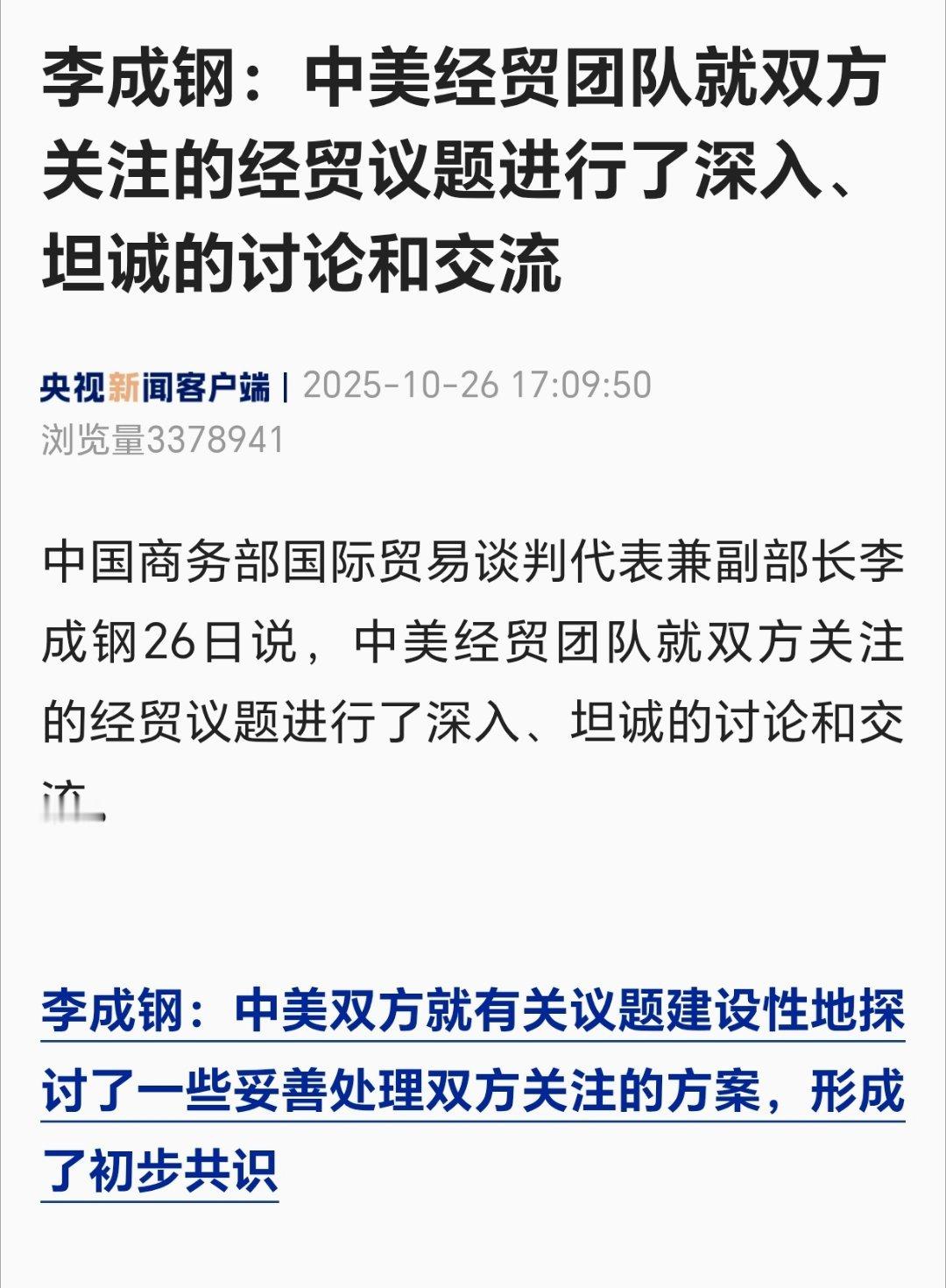 中美经贸团队进行深入坦诚交流李成钢:中美经贸团队就双方关注的经贸议题进行了深入、坦诚的讨论和交流