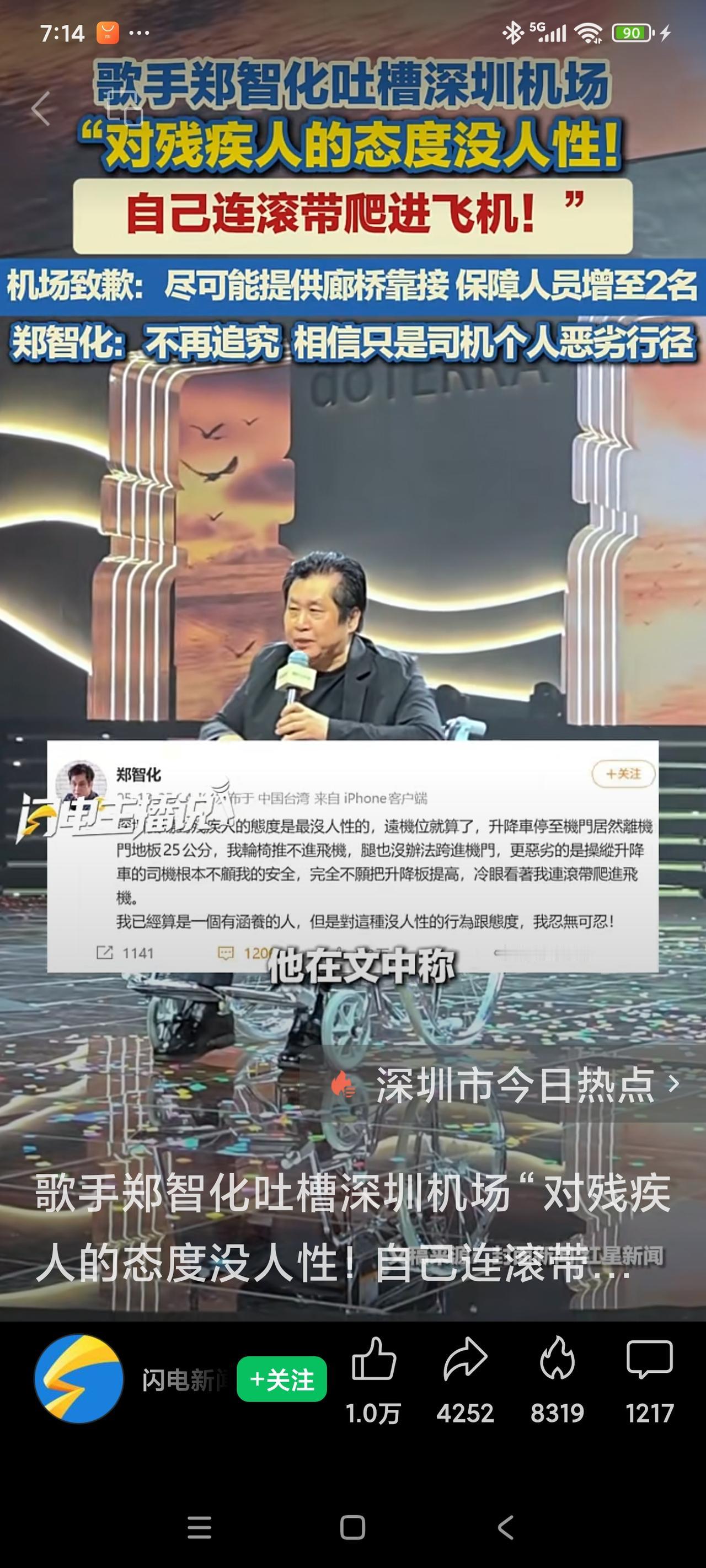 郑智化投诉什么 郑智化,九十年代的歌星。他架着拐杖,放声高歌的样子,让人印象深刻。 “风雨中,这点痛算什么?”,一个残疾人,能站在舞台上,他的自信,他的精神,成了我们励志的偶像。 昨天,大概是14:59,他发微博投诉深圳机场,说是深圳机场对残疾人的态度是最没人性的。 原因是他深圳机场搭机,飞机停在远机位,升降车与机舱门有高度差,更恶劣的是升降车司机完全不愿把升降车升高,冷眼看着他连滚带爬进机舱。 很快,就在他的微博下面,深圳机场公开回应。先是表示致歉,接着要进行核查,然后会审视与优化服务保障的细节。 随后,深圳机场用详细的“情况说明”,同时附加视频,算是对郑智化投诉给出的正式回复。 看完郑智化的投诉以及深圳机场的情况说明后,我总觉得有点怪怪的。 比如说,升降车与机舱门有25公分的高度差,这不是升降车司机的问题,而是航空安全规定。 既然是安全规定,那么,深圳机场或者航司地服人员,为啥不早做准备,或者早有措施呢? 郑智化说他是“连滚带爬”进机舱的,可视频显示,在14:38分,两名工作人员站在升降车上,一名搀扶他站起来,另一人一手扶轮椅一手协助他用拐杖。同时,有两名空乘也在机舱里面接应。 至于升降车司机似乎就没有出现。 对郑智化投诉的远机位,机场也进行了说明。当然了,机场的情况说明中,也有改进措施,包括增加工作人员到2名,使用有坡度的连接装置。 显然,深圳机场不但对投诉回应很快,而且改进措施更明确有效,这算是非常到位的舆情危机应对了。 台北人,有一定影响力的歌星,而且身为残疾人,说实话,这样的投诉自然能引起舆情,也能引来回应。 而从今天16:55,郑智化写的长文来看,他认为深圳机场的遭遇不是偶发,内地机场对残疾人“不友善”,甚至“刁难”,比较多。 比如说,他带支架的鞋、拐杖,这两样必须品在安检处常被“刁难”。残疾人搭乘飞机走旋梯等。 他继而感叹,他“去过全世界上百个机场,从来没有遇到过这种刁难”。 到此,我们算是明白了。郑智化他真正抱怨的是,在内地机场,对残疾人乘机非常的不友善。 对残疾人的态度,或者说出行的便利性,国内不仅仅是机场存在,也不仅是安检存在,类似问题真的不少。 相比而言,民航系统算是做的比较好的,也比较人性化的。安检的问题,是有点极端,而态度问题,只能说缺乏人性了。 就如郑智化一样,这些年来,他在大陆各地演出,往返各个机场的频率很高。如深圳机场遇到的问题,对安检,他是无力吐槽;对远机位和升降车,总不会是第一次遇到吧? 我不是说郑智化的投诉不对,不符合深圳机场情况说明的实际,而是说对残疾人不友善的社会氛围,的确是事实存在的。 有点感慨的是,残疾人出行也就是民航比较多些,其它交通工具上,或者城市街道,如今似乎很少见。 很少见的原因就是残疾人在外面非常的不方便。把人当人,尤其是对残疾人,更应该尊重,且在社会各个环节上都能“友善”便利。 起码,当残疾人都能与正常人一样,随意出行,自由生活时,我们社会才算是一个文明的社会。
