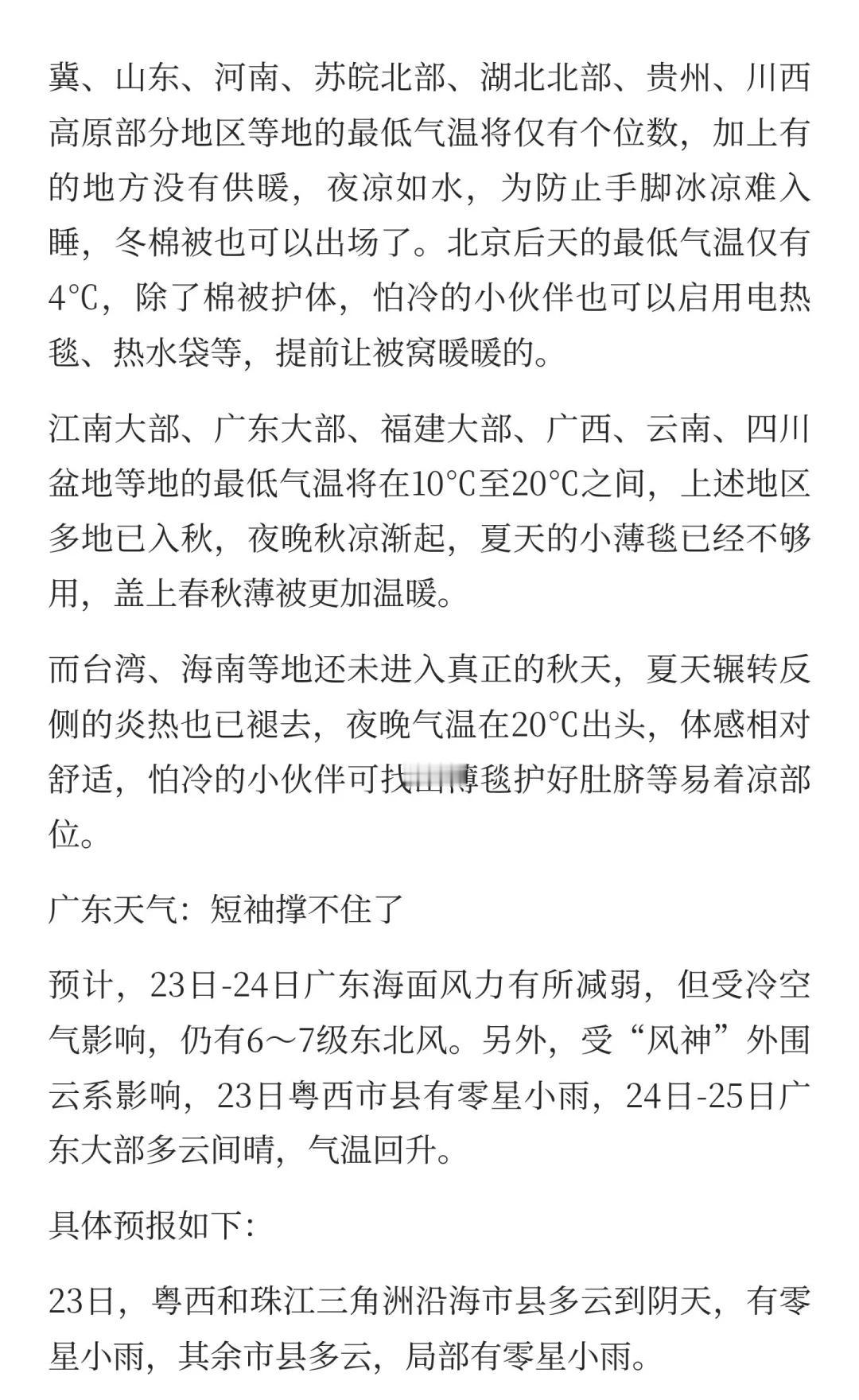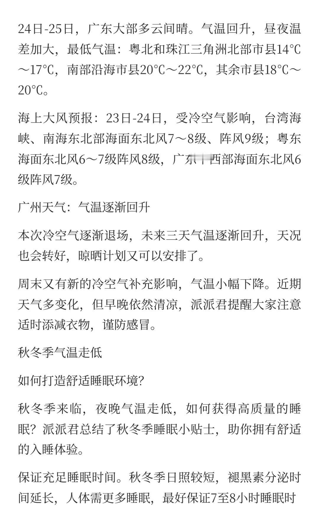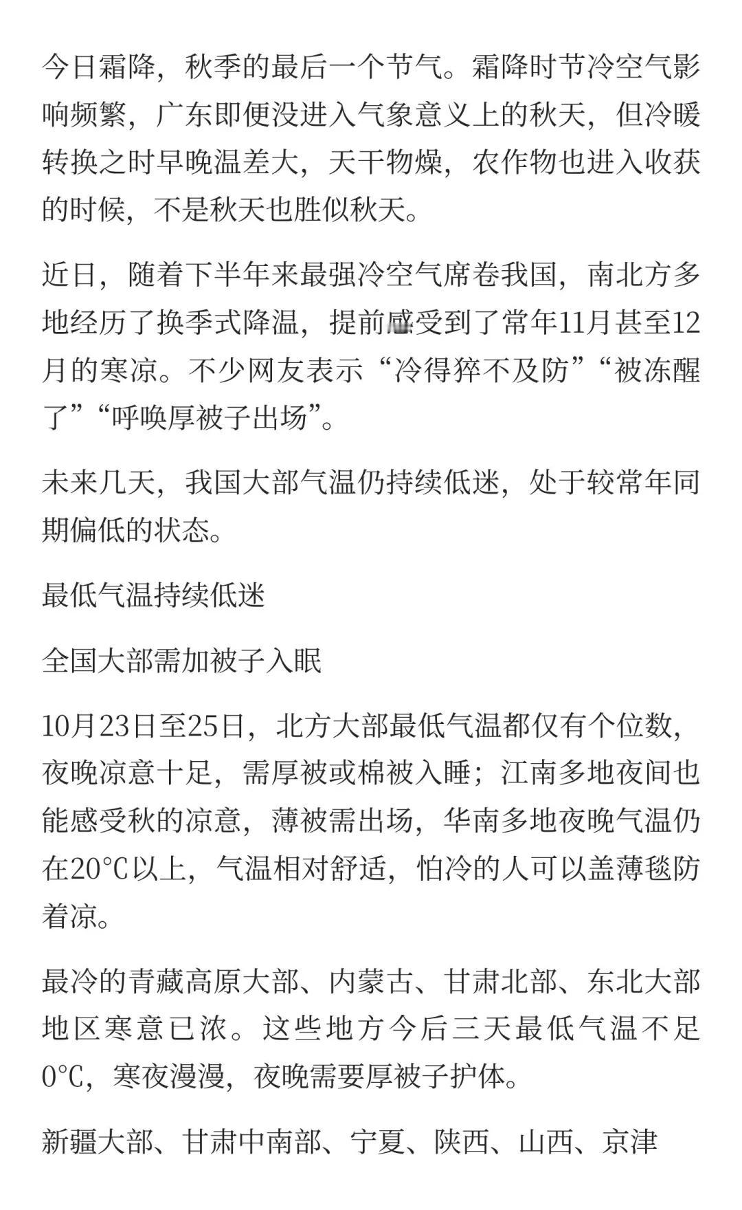 阳光逐步回归!广东气温略有回升,早晚依然 霜降节气,冷空气频繁,广东虽未入秋,但早晚温差大,天干物燥。未来几天,全国大部气温持续低迷,需加厚被子入眠。江南秋凉渐起,广东天气渐暖,提醒注意保暖,适时调整睡眠环境,确保舒适睡眠。南方气温将再下一个台阶 这天气翻脸比翻书还快 昼夜温差大 南北方温差