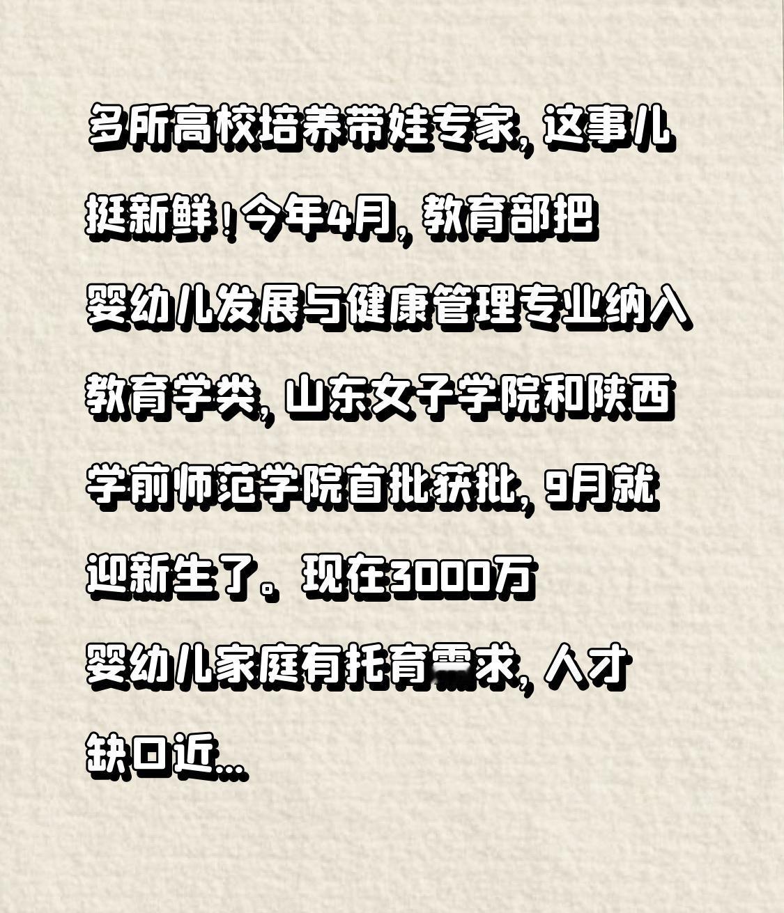 多所高校培养带娃专家,这事儿挺新鲜!今年4月,教育部把婴幼儿发展与健康管理专业纳入教育学类,山东女子学院和陕西学前师范学院首批获批,9月就迎新生了。 现在3000万婴幼儿家庭有托育需求,人才缺口近100万。齐鲁师范学院的学生通过AI仿真婴儿学带娃,从冲奶到哄睡都是教学内容,还得把“婴儿”带回宿舍,芯片记录操作数据生成照护报告。课程也不简单,要掌握七种急救措施,识别常见症状。这专业设立太及时,能解决不少双职工家庭“生得起、养不易”的难题。