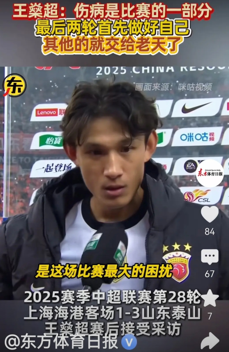 王燊超赛后接受采访时,并未因球队外援伤病致比赛失利而沮丧,他表示会认真踢好最后两场球,其余的就交给老天。这样的心态着实不错。