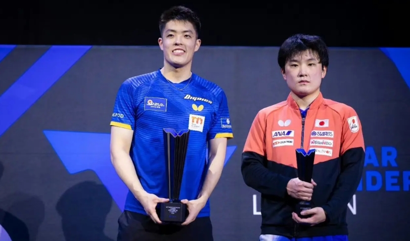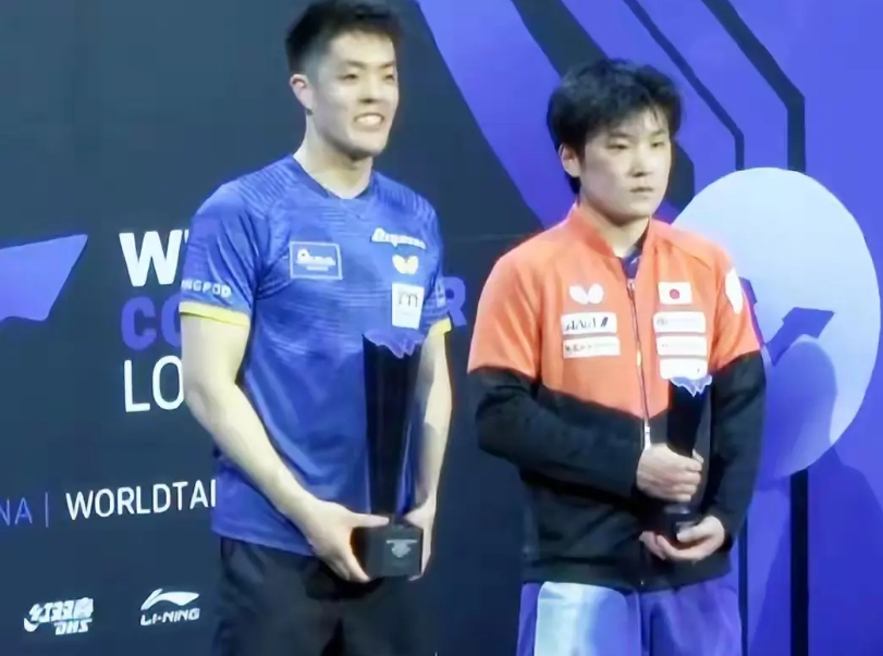 在伦敦球星挑战赛男单颁奖仪式上,张本智和全程黑脸,完全没说一句话,哪怕假笑都没挤出一点。