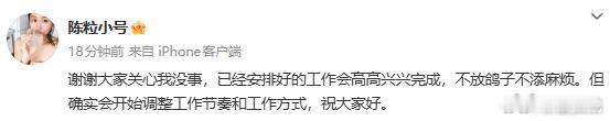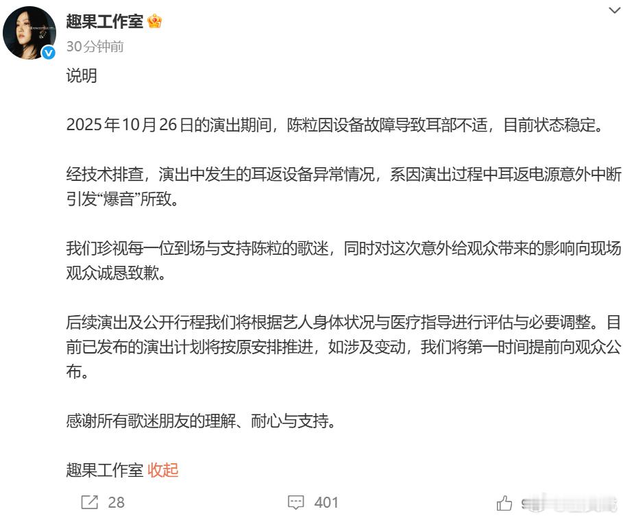 陈粒工作室报平安陈粒 不放鸽子不添麻烦 27日, 回应陈粒演出时耳机爆炸,称目前状态稳定,设备异常是因耳返电源意外中断引发“爆音”所致。随后,小号再发文,表示已安排好的工作会完成,“不放鸽子不添麻烦,但确实会开始调整工作节奏和工作方式。”