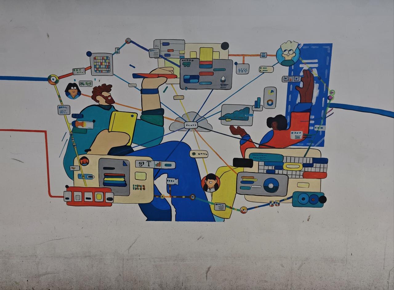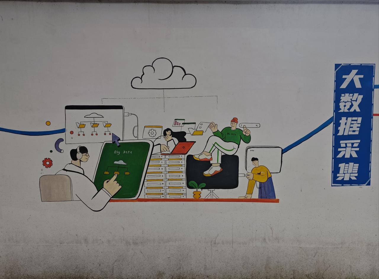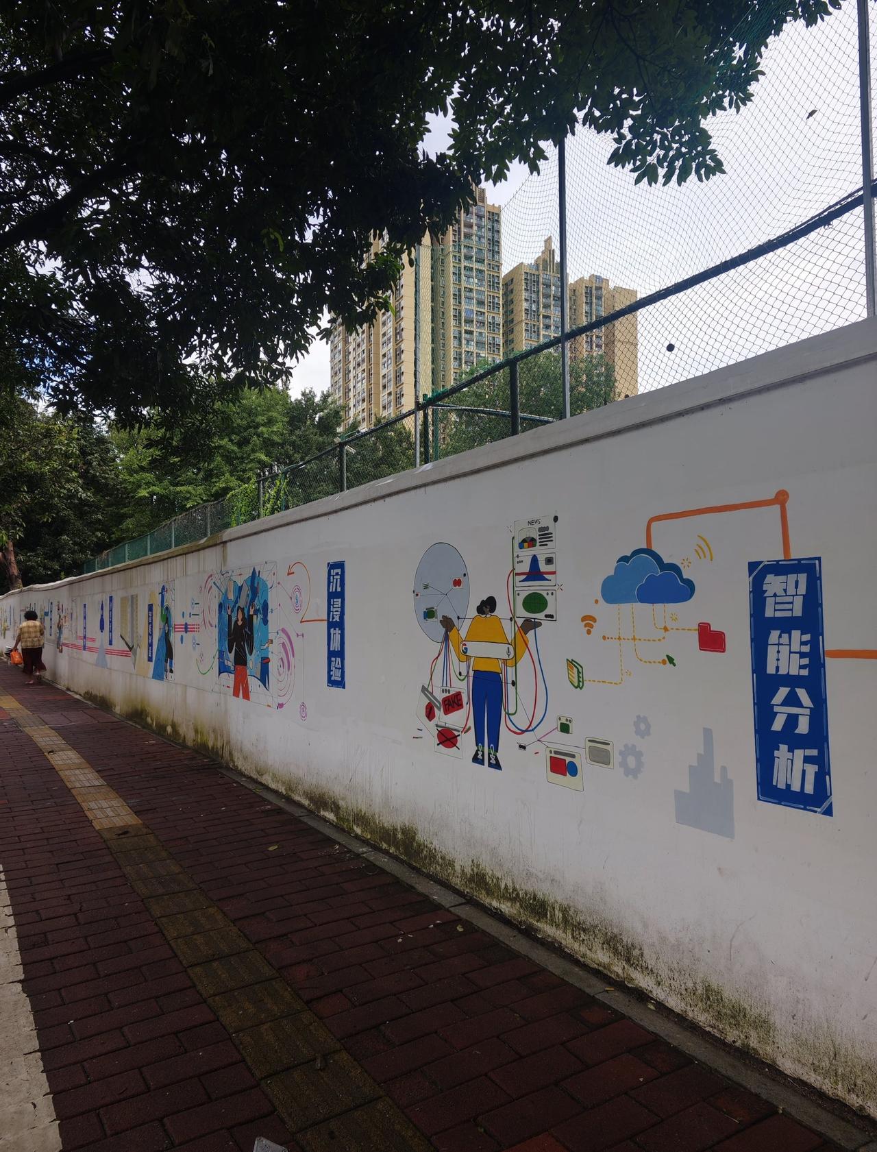 在仲恺学生宿舍旁,一条百米长的围墙化身为艺术长廊,缤纷的插画如音符般跃动。科技感十足的"沉浸体验""智能分析"字样与手持设备的人物相映成趣,绿意盎然的枝叶背景间隐约可见城市轮廓。每一处细节都散发着青春的活力与艺术的魅力,让人流连忘返。 0元玩转这座城涂鸦墙文化墙我的城市向导官