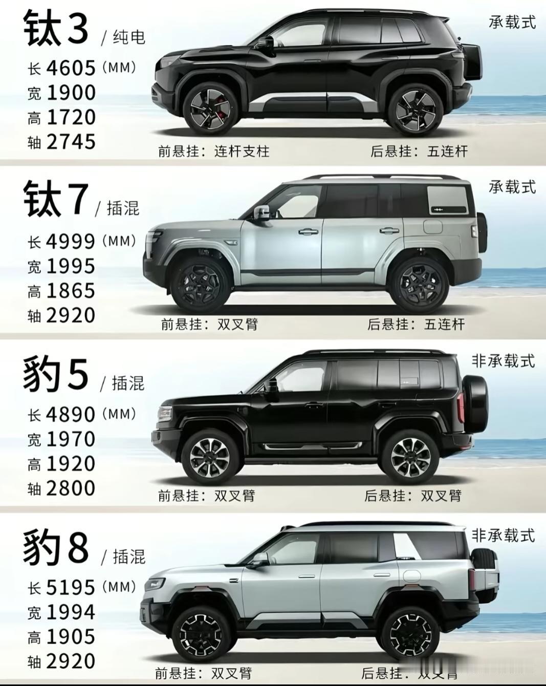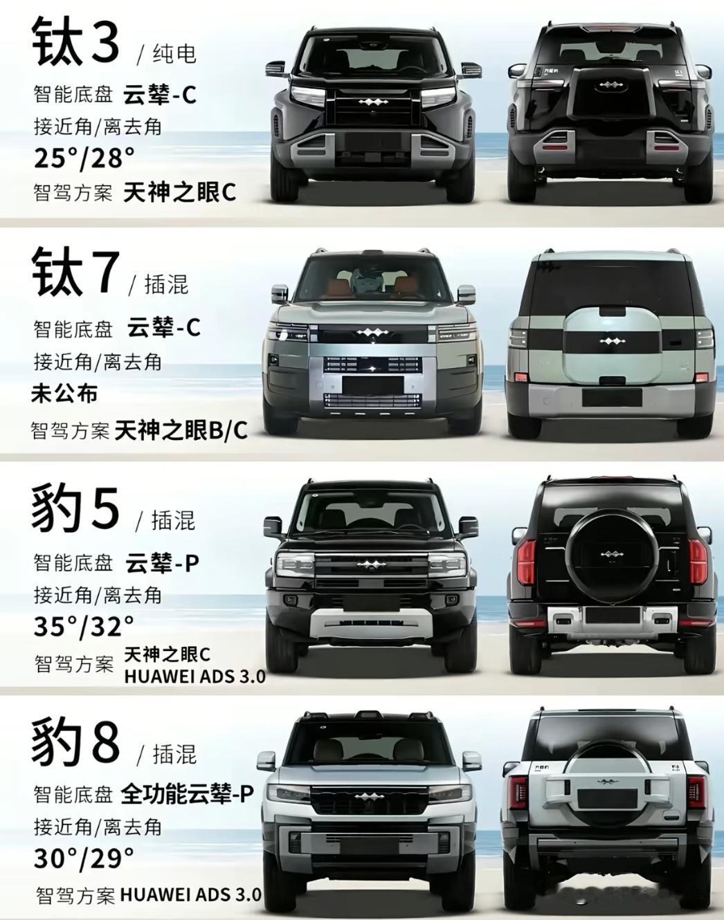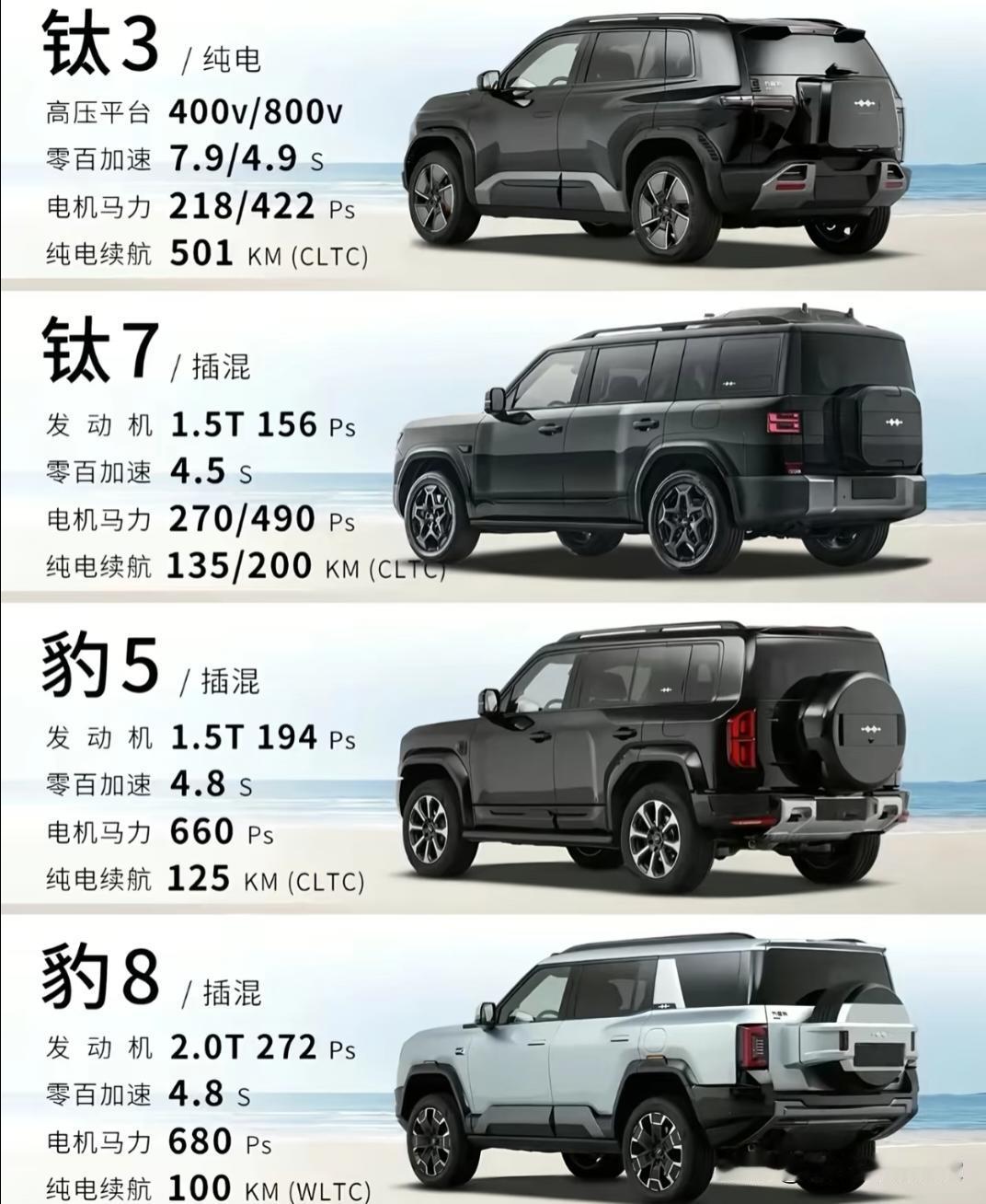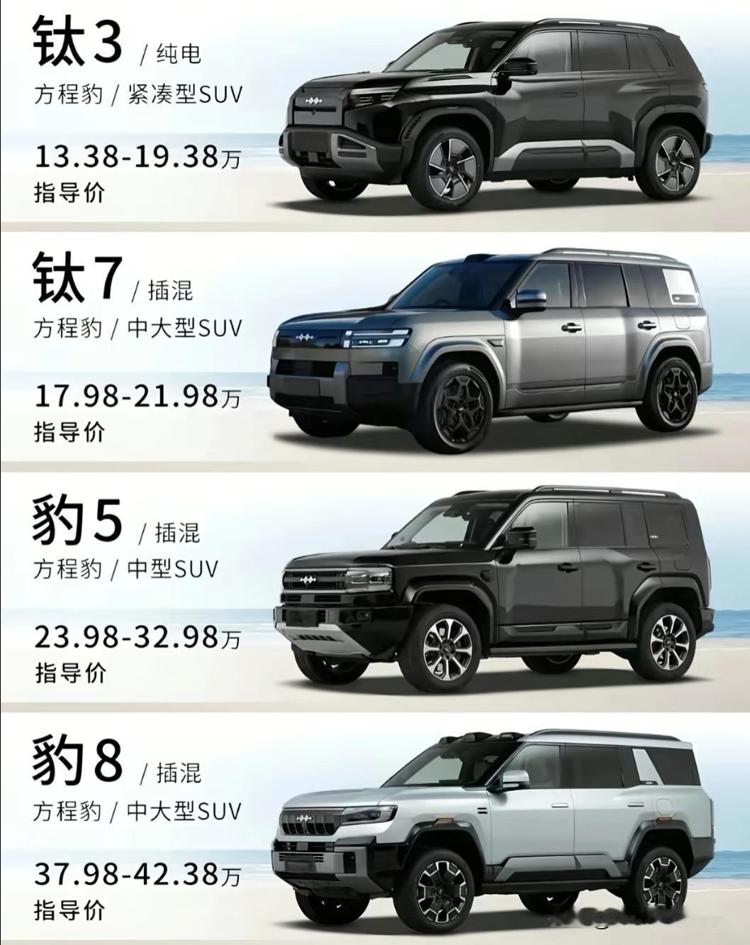 程豹全系图鉴,比亚迪的个性化新物种 今天来盘盘比亚迪旗下的"个性玩家" 每台车都是可城可野的时尚单品 看完秒懂什么叫"每个人的专属大玩具"! 1.玩家选购指南: ▫️首推豹5领航版!32万享DMO混动+三把锁 ▫️必选云辇-P系统(越野舒适两不误) ▫️现在下单送原厂改装套件(价值2w+) 2.个性冷知识: 品牌LOGO灵感来自数学函数图 DMO平台可实现"豹式掉头" 连车灯都能自定义灯语!