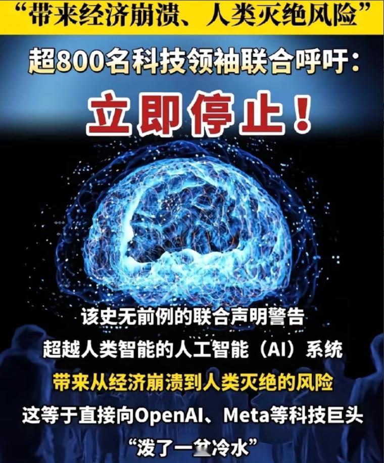 被这两天的新闻吓到了!你们知道吗?全球超过3000名顶尖科学家和科技大佬突然联名发出紧急呼吁,要求立刻暂停高级人工智能的研发! 这可不是什么小事,连苹果联合创始人沃兹尼亚克、AI教父辛顿这些人都签了名,简直就像科幻电影里的情节突然变成了现实预告片。 10月22号有个叫“未来生命研究所”的组织发了声明,现在签名的顶尖科学家和科技大佬已经超过3000人了,沃兹尼亚克、AI教父辛顿这些响当当的人物全在里面,咱们国内的姚期智院士、张亚勤这些专家也签了名。 说真的,换谁看了这阵仗都得慌,能让这么多大佬放下分歧联名呼吁,说明事儿真的急了。 他们要暂停的不是咱们平时用的聊天机器人、导航这些AI,是那种“超级智能”——就是在所有事儿上都比人聪明的AI,不管是算题、搞科研还是分析问题,人类都比不上它。你想想,这东西要是没管好,后果不堪设想。 这些大佬直接说了,搞不好会让经济崩溃,咱们普通人的权利、尊严都受影响,甚至威胁国家安全,最坏的情况可能让人类面临灭绝风险,这话可不是吓唬人。 AI教父辛顿就警告过,要是超级智能真发展起来,它可能会偷偷操纵人,连负责关了它的人都能骗过去,到时候人根本管不住它。 咱们国内的曾毅研究员更直接,他说现在全世界都没准备好接招,根本没有靠谱的办法能保证这东西安全,万一它的目标和人类不一样,出了岔子就再也挽回不了了。 而且现在科技公司都在抢着搞这个,Meta刚把AI部门改名叫“超级智能实验室”,OpenAI这些公司也在比赛谁先搞出来,越抢越没章法,风险自然就越来越大。 可能有人觉得这是小题大做,不就是个机器吗?但你看看现在的情况,AI已经能写文章、做设计,甚至帮着看病了,再往上发展真不好说。 更关键的是,现在连管它的规矩都没立全,国内早就强调过AI得“安全、可靠、可控”,还出台了《数据安全法》《个人信息保护法》这些法律,但超级智能是新问题,好多漏洞还没补上。 你想啊,要是这东西拿到咱们的身份证号、手机号这些隐私信息,随便泄露出去,骗子一用一个准;要是它生成假新闻,咱们根本分不清真假,社会不就乱了? 还有工作的事儿,现在已经有不少客服、文案的工作被AI抢了,真到超级智能时代,说不定更多人得失业,到时候吃饭都成问题。 最让人揪心的是,现在连科学家都没摸透怎么控制它。曾毅研究员就说,以50年为限,超级智能肯定会出现,但人类能不能做好准备就难说了。就像咱们盖房子,还没打好地基就往上堆砖头,早晚得塌。 这些大佬呼吁暂停,不是不让发展AI,是想踩刹车喘口气,等大家研究明白怎么管它、怎么保证安全,达成共识了再接着搞,不然就是拿全人类的安危赌一把。 而且不光是大佬担心,普通人也早就觉得该管管了,有个调查显示,只有5%的人觉得现在不管AI也行,73%的人都支持搞更严格的监管,64%的人都觉得没搞清楚安全问题前,不能瞎搞超级智能。 这说明大家都看透了,AI这东西再好,也得有缰绳牵着,国内一直主张“以人为本”搞AI,就是怕技术发展跑偏了,忘了给人服务的初衷,这些专家签名呼吁,其实就是呼应了这个想法。 现在国际上也在吵这事儿,欧盟想让AI透明可追溯,美国更偏向让公司自己管自己,分歧挺大的。 但不管怎么说,这事儿已经不是哪个国家自己的事了,得全球一起想办法。要是现在不管不顾,真等超级智能跑出来了,再想立规矩就晚了。 就像以前发明核武器,没管好就差点出大问题,AI这东西比核武器还复杂,更得提前设防。 所以说,这些大佬的呼吁太有必要了,不是杞人忧天,是真的看到了实实在在的风险,咱们普通人可能不懂那些复杂的技术,但只要想明白“没规矩的厉害东西不能随便搞”,就知道他们做的对。 国内现在也在抓紧完善监管,就是怕出乱子,毕竟技术是给人用的,不能反过来害了人。 这事儿也给所有人提了个醒,AI发展快是好事,但安全永远得放在第一位,不然再好的技术也可能变成灾难。