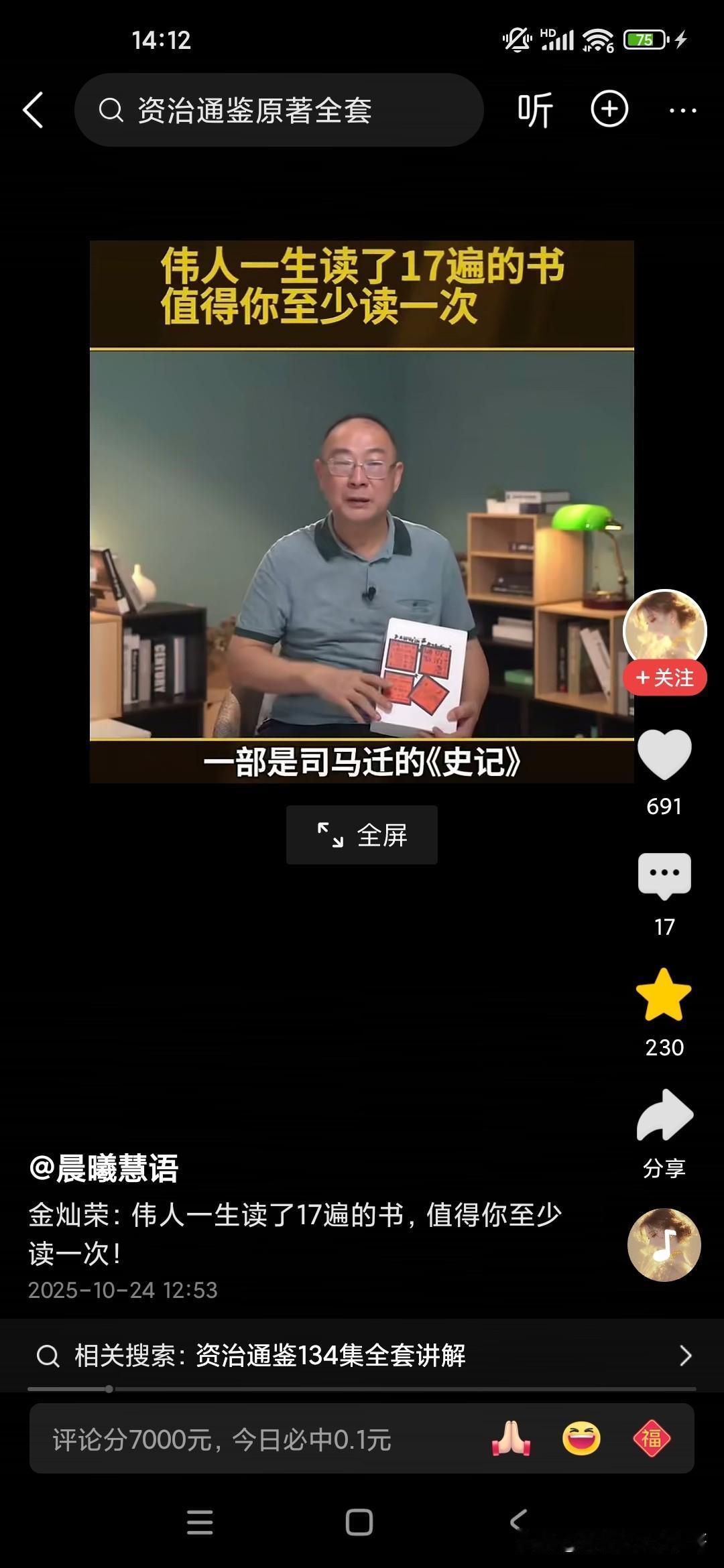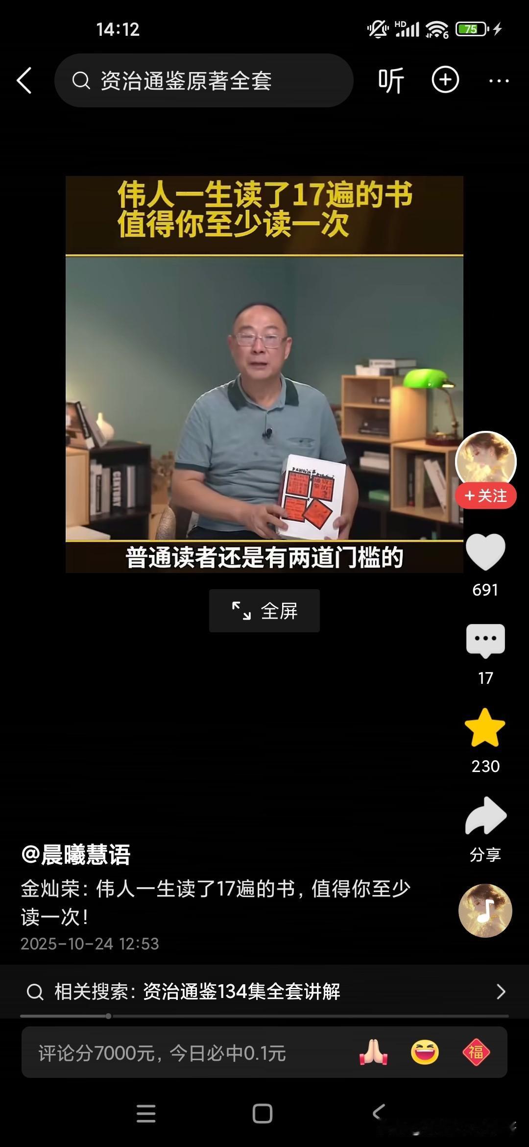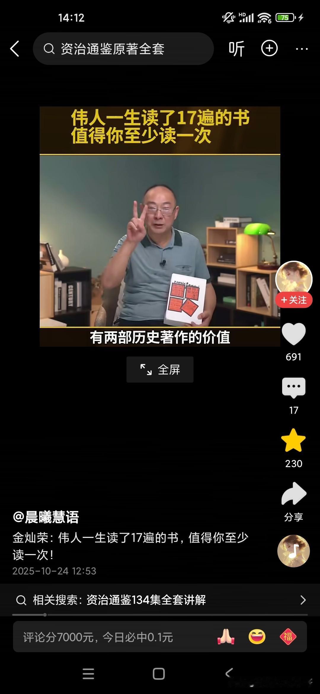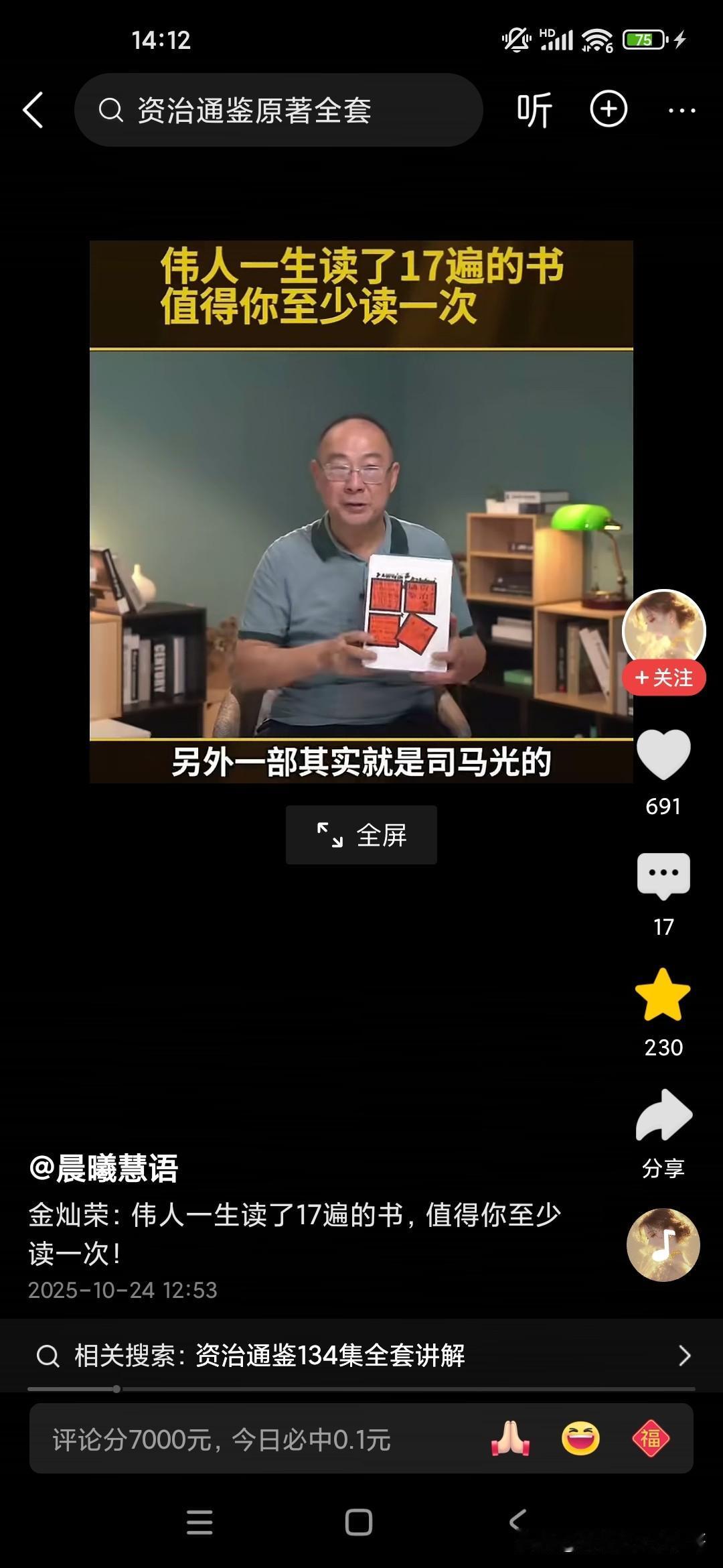 金灿荣教授说,主席生前最喜欢读的一本书就是资治通鉴,他总共读了17篇之多,作为我们普通人,读史可以明志,如果我们想开阔自己的视野,鉴古知今就可以最起码读一遍资治通鉴,但是资治通鉴的话全部是文言文,而且年代比较久远,如果我们想读懂的话,最好读柏杨先生已经翻译过来的版本,资治通鉴是经过历史检验的历史大著作,就是史学两司马,一个是司马迁,一个是司马光,一个是司马迁的史记,一个是司马光的资治通鉴,而且是耗费19年才完成,如果我们能够认真从这历史著作中读的话,肯定会吸取到很多智慧,如果你觉得自己特别的焦虑,特别的迷茫,特别的不知所措的时候,可以好好读一读资治通鉴,可能会对你的人生有很大的启发。