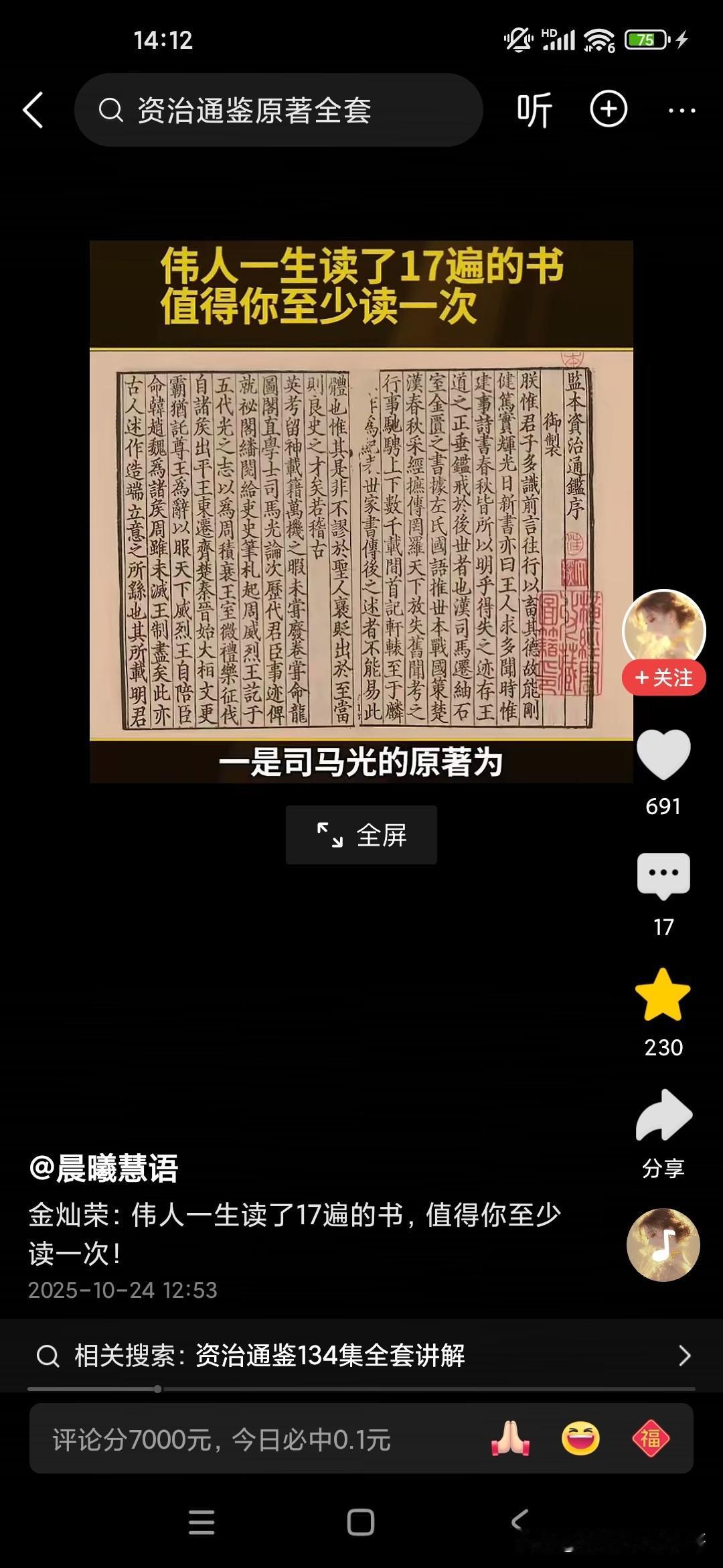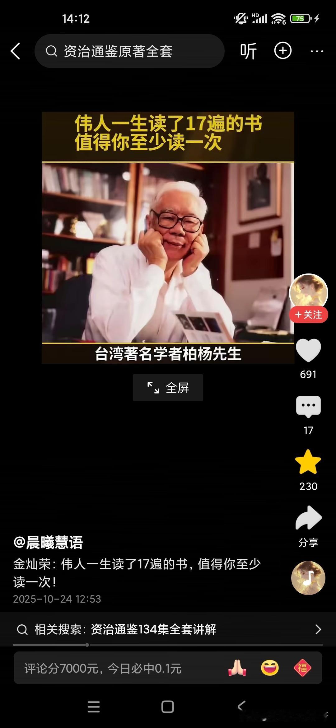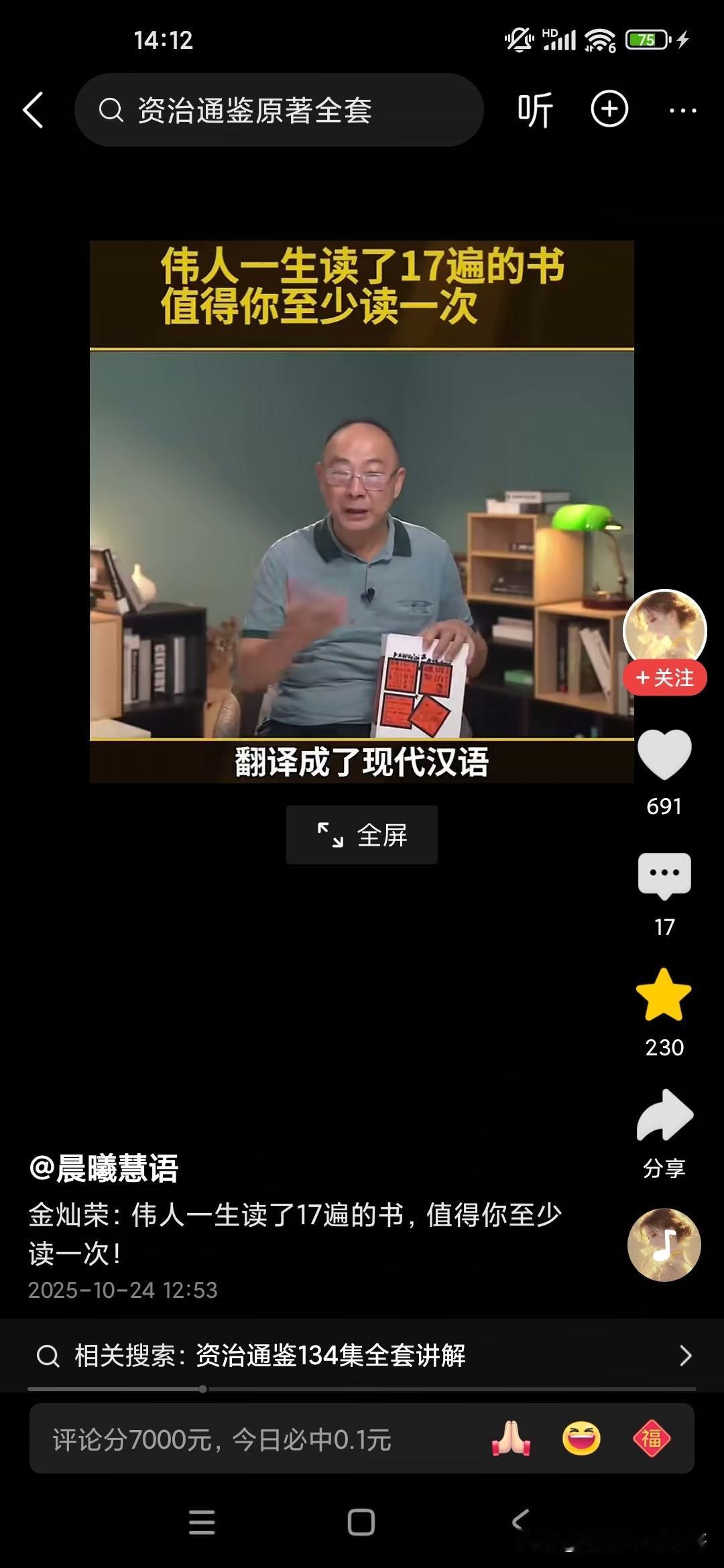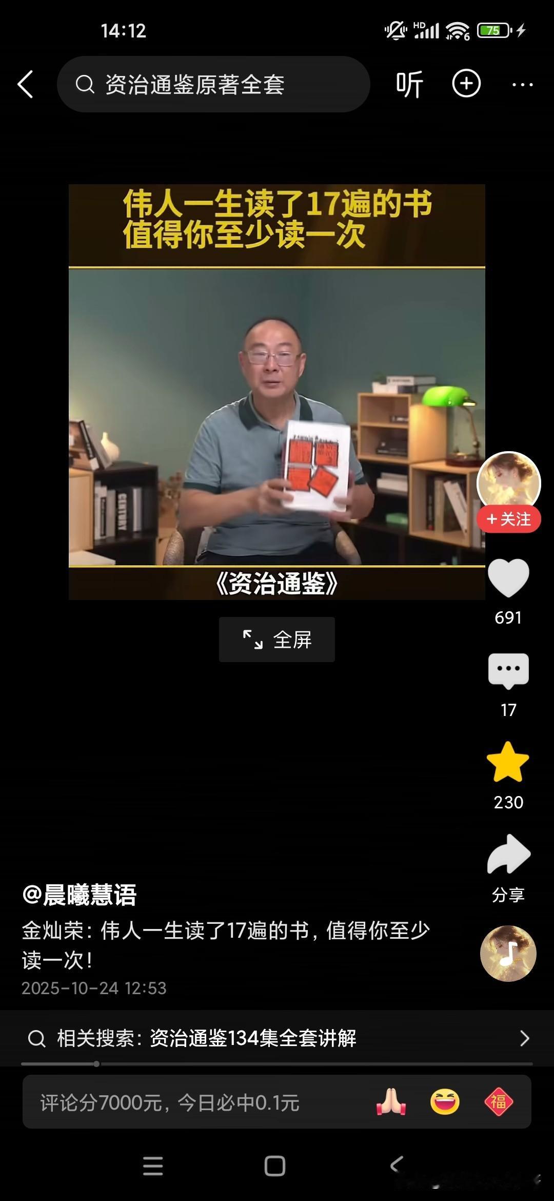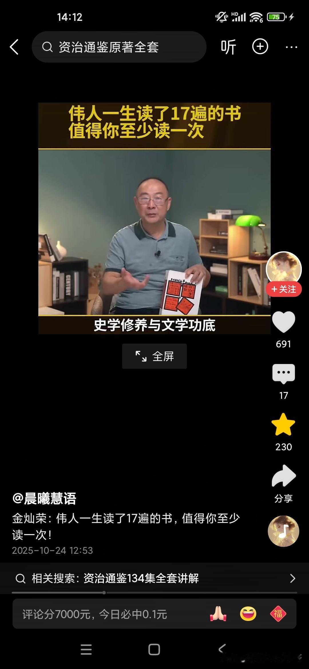 金灿荣教授说,主席生前最喜欢读的一本书就是资治通鉴,他总共读了17篇之多,作为我们普通人,读史可以明志,如果我们想开阔自己的视野,鉴古知今就可以最起码读一遍资治通鉴,但是资治通鉴的话全部是文言文,而且年代比较久远,如果我们想读懂的话,最好读柏杨先生已经翻译过来的版本,资治通鉴是经过历史检验的历史大著作,就是史学两司马,一个是司马迁,一个是司马光,一个是司马迁的史记,一个是司马光的资治通鉴,而且是耗费19年才完成,如果我们能够认真从这历史著作中读的话,肯定会吸取到很多智慧,如果你觉得自己特别的焦虑,特别的迷茫,特别的不知所措的时候,可以好好读一读资治通鉴,可能会对你的人生有很大的启发。