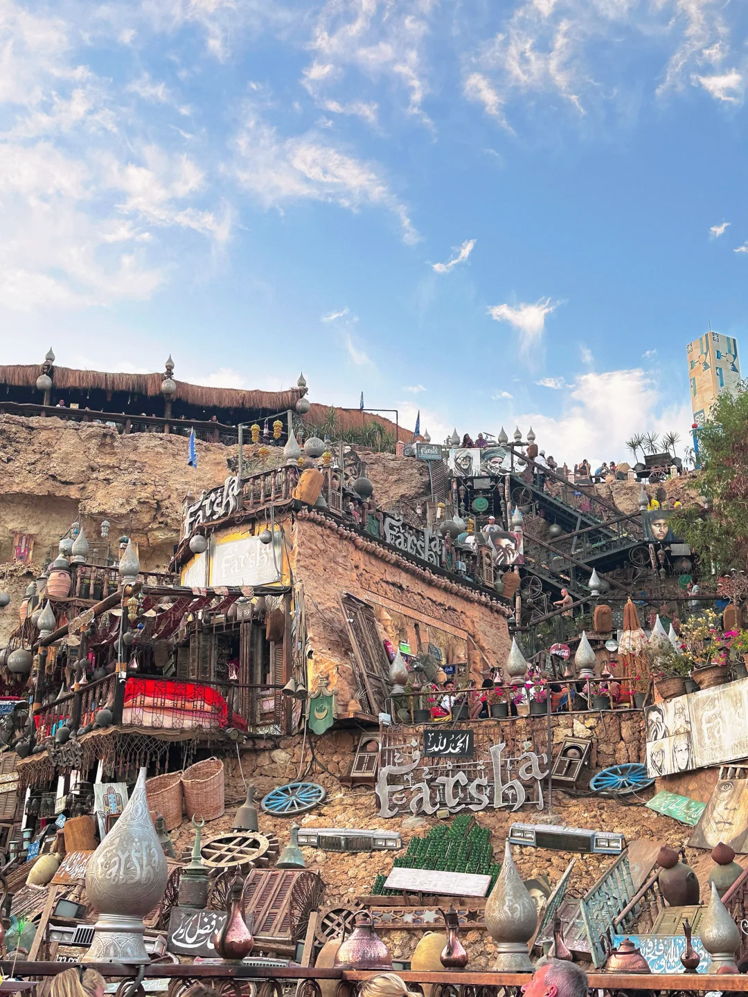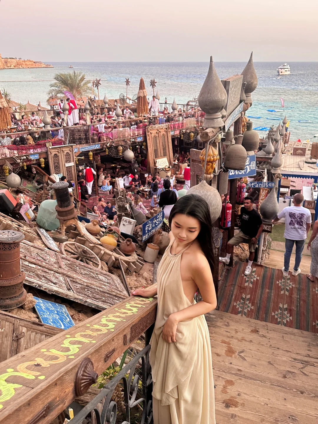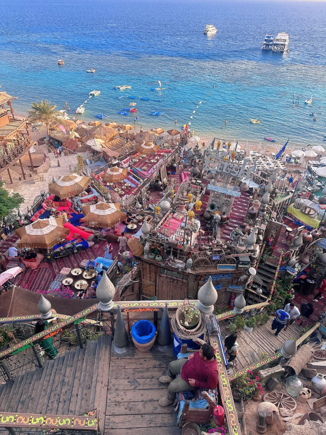 我是直飞沙姆沙伊赫的,这边除了这家悬崖酒吧跟潜水几乎没什么玩的,不用特意为了悬崖酒吧飞过来。据说是垃圾堆积起来的,非常异域风,其实挺脏的。这边有全世界的游客来打卡,人也很好,会主动让位置给拍照,也会上来合影