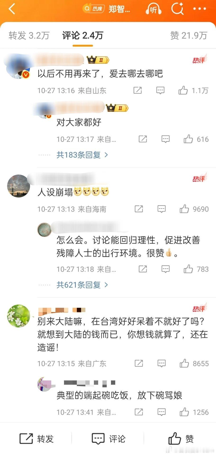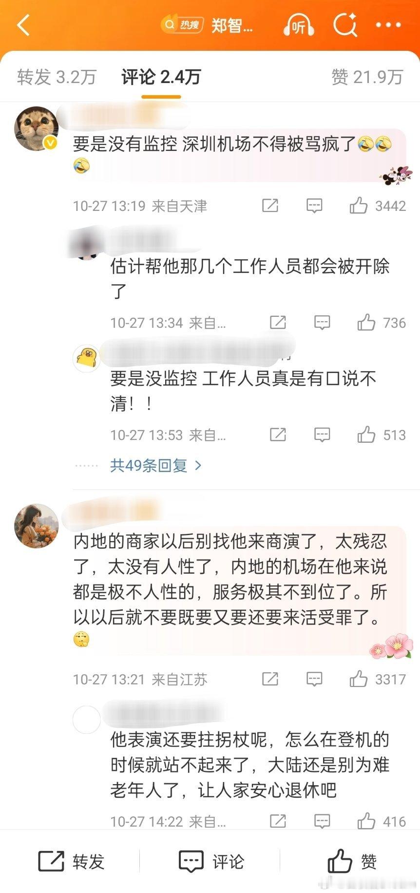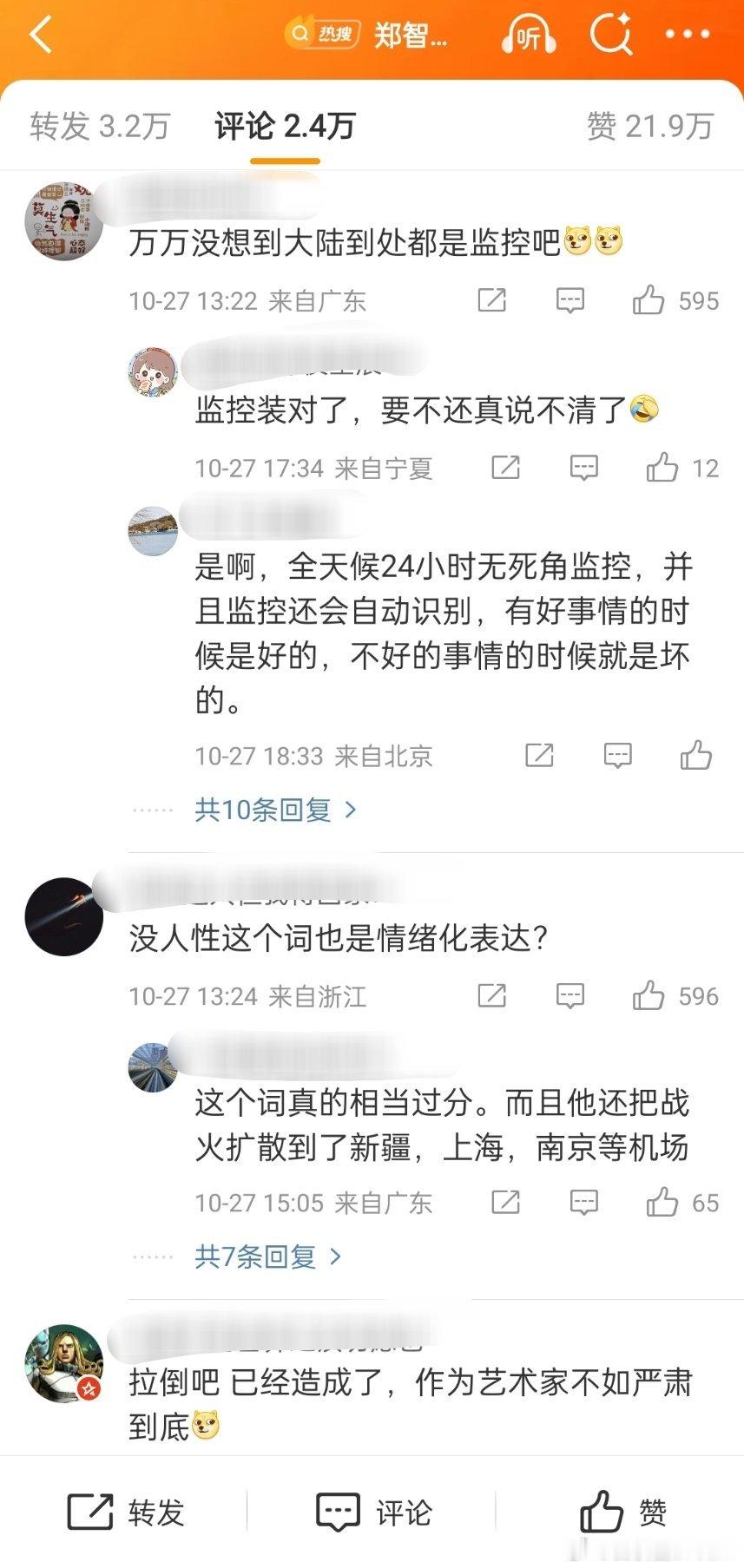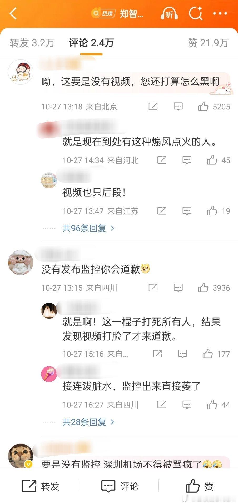 胡锡进谈郑智化道歉🔻郑智化的评论区已经变成这样了。深圳机场以后一定要多装摄像头了!要是那个位置刚好没监控,后果不堪设想.....[摊手][摊手][摊手]
