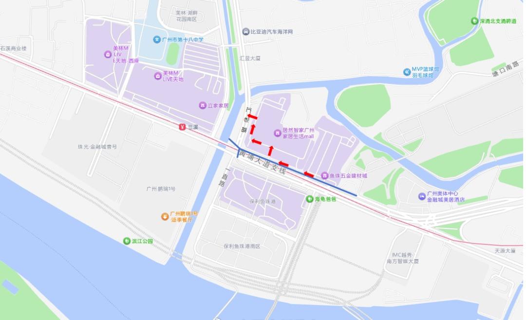 广州城事【注意绕行!这一路段将要施工】据广州市中心区交通项目管理中心,为保障鱼珠隧道工程的顺利推进,计划于2025年10月30日起,对黄埔大道东支线桥及黄埔大道东(向西行)部分路段,进行围蔽施工,实施管线迁改作业,本次施工预计持续至2026年4月18日。汇彩路路口分阶段进行施工围蔽时绕行指引路径如下:黄埔大道东辅道(向西行)→进入居然之家广场内部路→汇彩路。(广州黄埔发布)