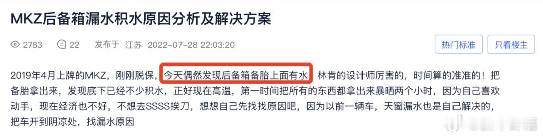 双方就补偿也没谈拢:车主希望彻底解决漏水、检查线束+5次保养工时费补偿,厂家只愿免3次。更让人不安的是,网络上已有多名林肯车主反馈类似后备厢积水问题,也有不少关于林肯售后维修不规范、技术差的投诉[无聊]