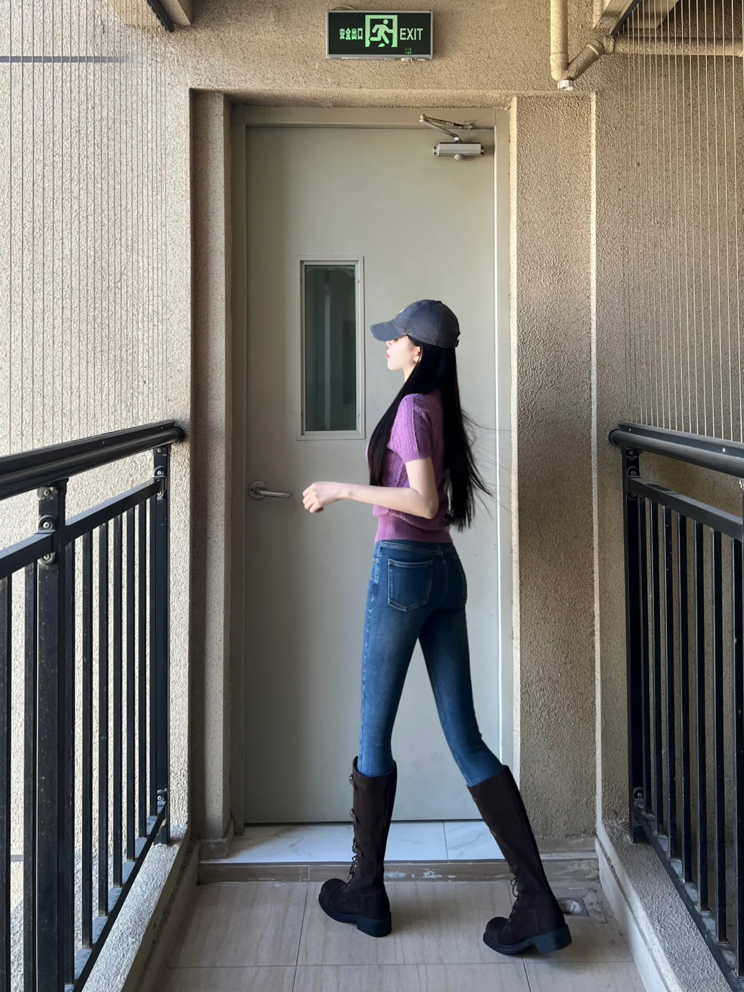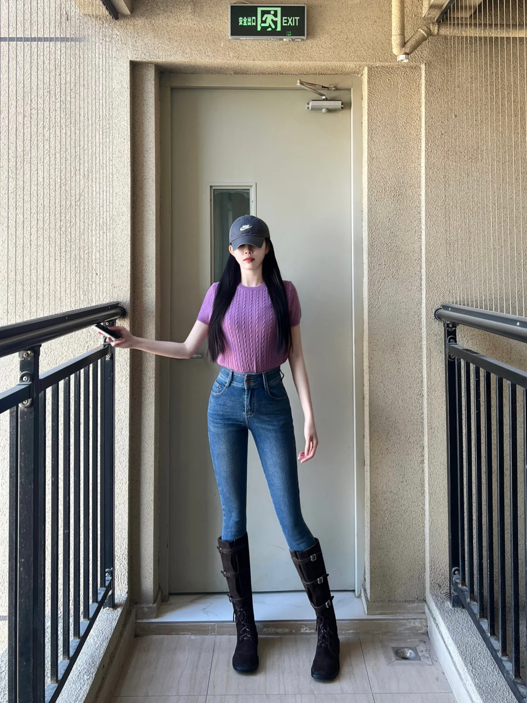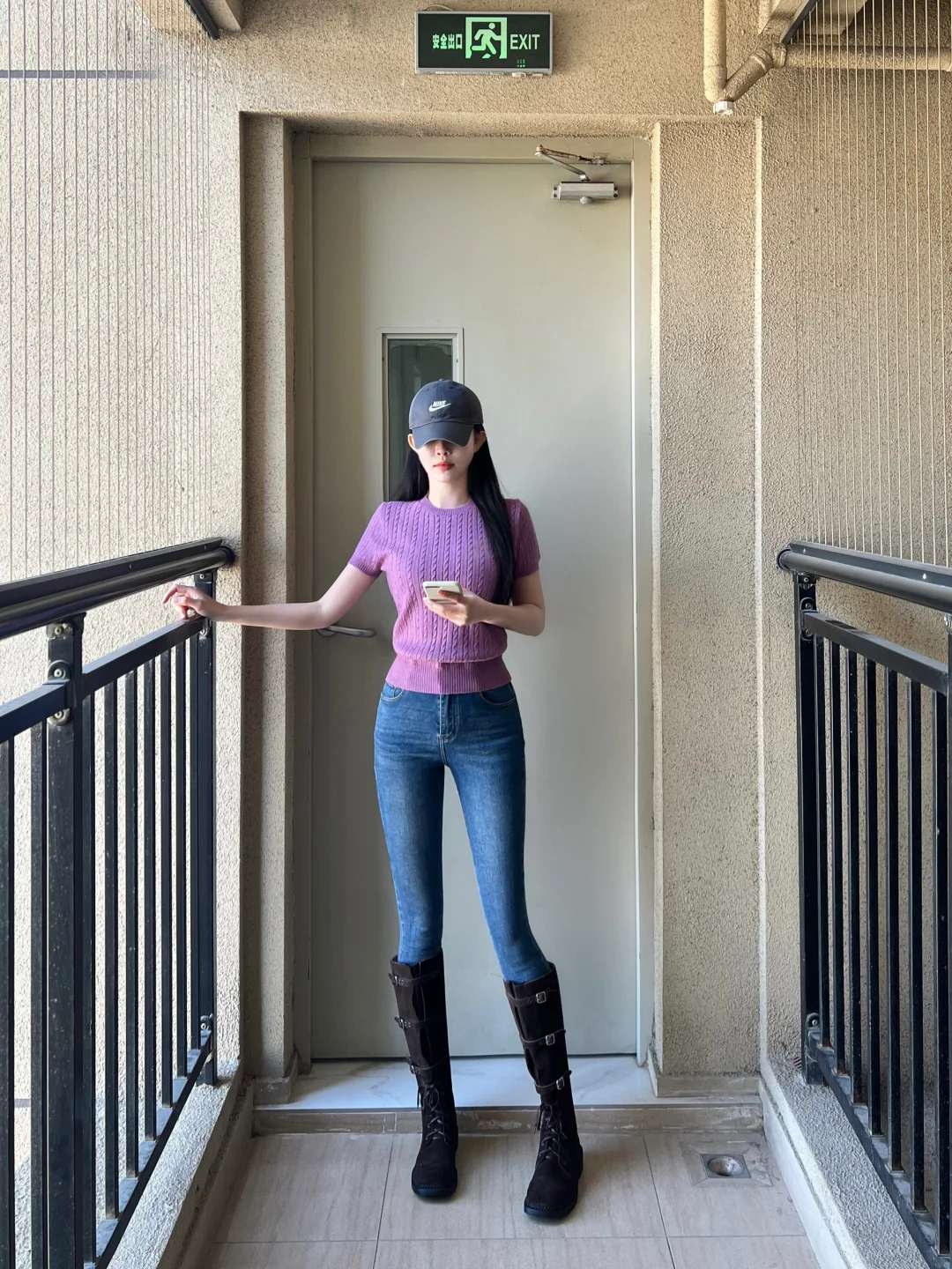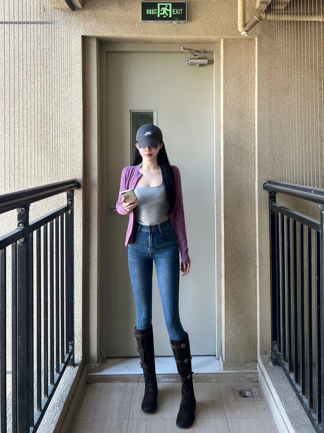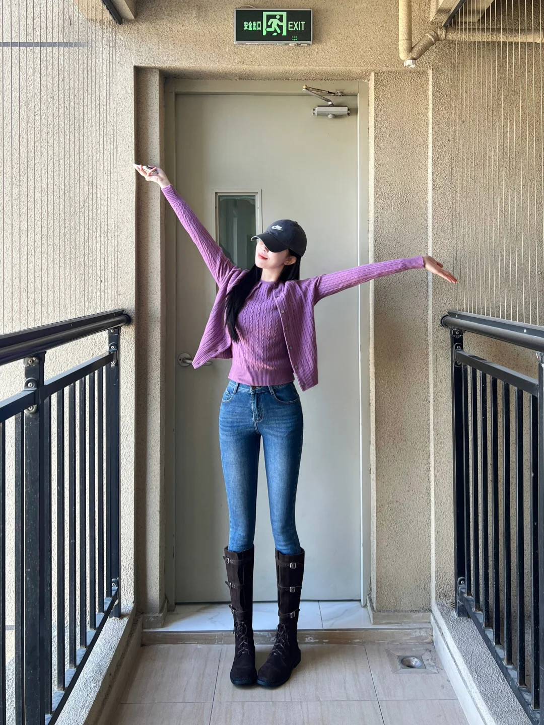 紫色系 显身材穿搭 长靴 紧身牛仔裤 开衫