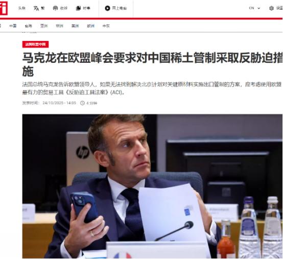 欧洲现在被中国反制裁后知道痛了?当年中国被《巴统》和《瓦森纳协议》制裁的时候欧洲可是第一个跳出来支持的,不仅支持,甚至还牵头制定了禁运标准,现在中国的大棒砸到了欧洲的头上,叫唤是没用的! 10月24日,法广报道称,马克龙23日在布鲁塞尔举行的欧盟峰会上表示,如果无法找到解决北京计划对关键原材料实施出口管制的方案,应考虑使用欧盟最有力的贸易工具《反胁迫工具法案》(ACI)。 这话听起来唬人,但明眼人都知道,欧盟这是被中国反制裁反得没辙了,才搬出这种"纸老虎"工具来撑场面。 要论制裁的历史,欧洲可是中国的"启蒙老师"。上世纪40年代末,欧洲跟着美国搞了个《巴统》协议,专门针对社会主义国家搞技术封锁,中国的半导体、航空航天等关键领域被卡得死死的。 后来《巴统》解散了,欧洲又牵头搞了《瓦森纳协议》,把限制范围扩大到民用技术,华为、大疆这些中国科技企业没少被他们整。 那时候欧洲多威风啊,觉得自己捏住了中国发展的命脉,可现在风水轮流转,中国反手就是一记重拳,直接打在了欧洲的七寸上。 中国这次反制裁的核心武器是稀土,稀土这东西别看名字不起眼,却是高科技产业的"维生素",从智能手机到新能源汽车,从雷达导弹到卫星通信,样样都离不开它。 中国掌握着全球90%以上的稀土精炼技术,欧盟98%的稀土磁铁依赖中国进口。大众汽车每个月要从中国进口2000吨稀土永磁材料,没这东西,旗下新能源汽车的电机根本转不起来。 荷兰的阿斯麦公司,其光刻机所需的稀土永磁材料几乎全部依赖中国。可以说,中国要是断了稀土供应,欧洲的高科技产业就得停摆。 面对中国的稀土管制,欧洲慌了神。马克龙威胁要动用《反胁迫工具法案》,但这个法案就是个"纸老虎"。要启动ACI,需欧盟成员国多数投票通过,且流程冗长,从提案、评估到实施,至少需要一年时间。 而在这段时间内,欧盟产业链若无法获得稳定稀土供应,其损失将是实打实的。更尴尬的是,欧盟这个法案原本是用来对付美国的,可面对美国的关税大棒,欧盟一次都没敢用,现在却拿来威胁中国,这不是典型的"欺软怕硬"吗? 其实中国的稀土管制完全合法合规,只是禁止用于军事目的,民用领域该放的都放了。商务部早就明确表态,会"采取一切必要措施维护企业权益",同时也为合规的欧洲企业设立了"绿色通道"。 今年8月,中国对欧盟稀土磁铁出口量达2582吨,是美国同期进口量的三倍,这说明正常贸易根本没受影响,欧盟的担忧更多是政治化解读。 要说欧洲现在的困境,完全是自己作出来的。这些年,欧洲一直在将高污染、低利润的稀土开采和初炼环节转移到中国,自己则专注高端制造。 可现在中国掌握了稀土精炼技术,欧洲又想通过制裁把产业链夺回去,哪有这么便宜的事?欧盟推出的《关键原材料法案》号称要在2030年实现40%的稀土本地化,但目前来看,这个目标遥不可及。 瑞典北部倒是开了个稀土矿,可提炼需要的萃取剂得从中国进口,技术专利也在中国人手里,就算挖出来矿石,也得运到中国提炼,再卖回欧洲,根本没减少依赖。 更讽刺的是欧洲一边喊着要"战略自主",一边却跟着美国对华搞限制。德国车企代表在欧盟内部会议上当场反对制裁,他们在华工厂每年要从中国进口近百万套零部件,制裁等于给自己断供。但波兰、捷克这些东欧国家,却一个劲地附和,理由是"要跟紧美国步调"。这种"窝里斗"的局面,让欧盟在应对中国反制裁时显得格外无力。 中国这次反制裁,不仅打在了欧洲的经济命脉上,还打在了欧洲的政治面子上。荷兰政府以国家安全为由欲接管中资企业安世半导体,中方随即禁止其子公司向荷兰出口芯片,这一对等反制,是对"泛化国家安全"逻辑的明确驳斥。 德国外长原定的访华行程被推迟,原因是德方计划讨论的议题——中国对稀土出口的管控以及安世半导体问题——均涉及中方核心利益,德方希望中方单方面让步,这显然不现实。 现在的欧洲,就像一个被宠坏的孩子,以前总是欺负别人,现在被别人打了一拳,就哭天喊地。可国际政治就是这么现实,没有永远的强者,也没有永远的弱者。中国这次反制裁,不是要和欧洲彻底闹翻,而是要让欧洲明白,合作才能双赢,对抗只会两败俱伤。 如果欧洲继续执迷不悟,非要在错误的道路上走下去,那最终吃亏的只能是自己。毕竟,中国有14亿人口的超级市场,有全球最完整的工业体系,还有"一带一路"朋友圈的强力支撑,而欧洲呢,除了一堆过时的制裁工具,还剩下什么? 来源:观察者网【马克龙急得跳脚:真没招,欧盟就对中国启动“核选项”】