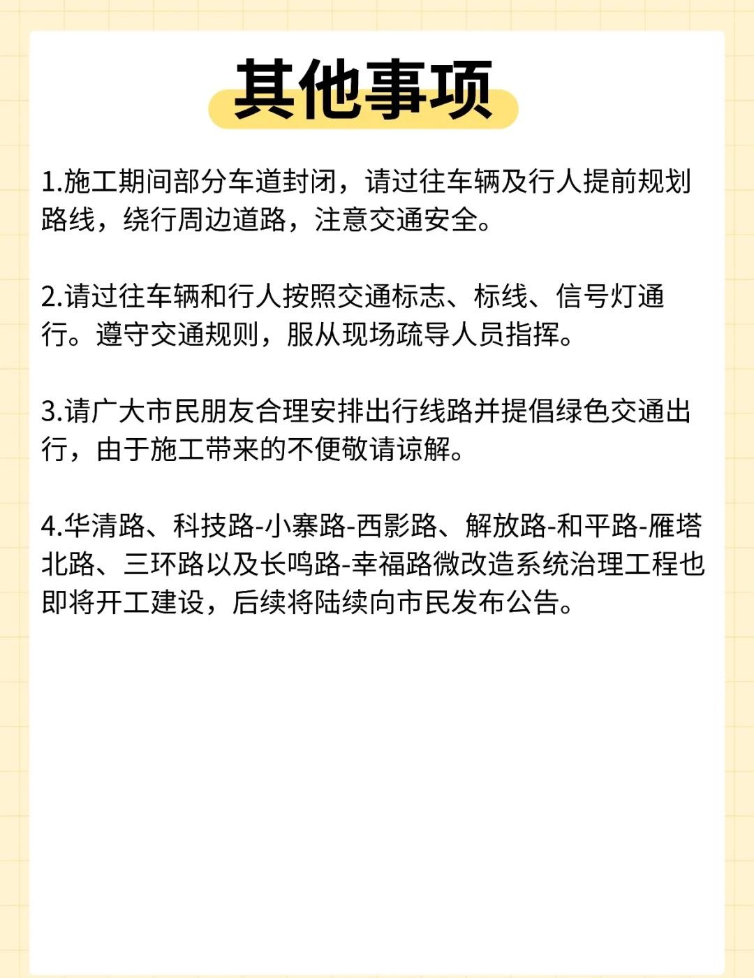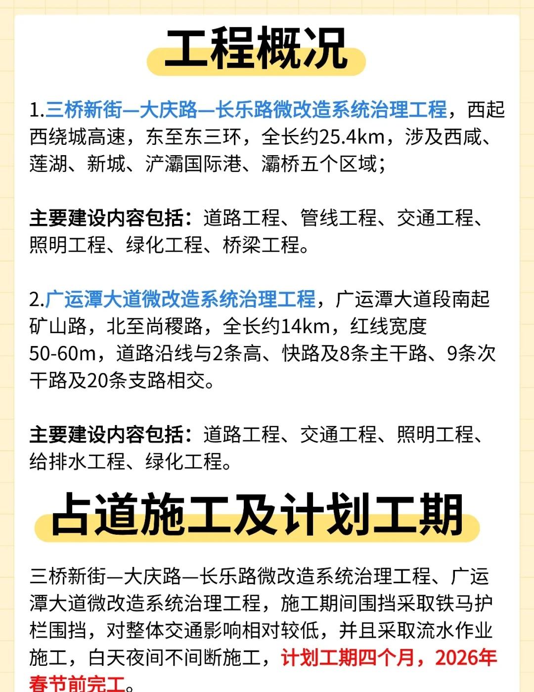 西安两个区域启动改造❗2026年春节前完工 🔔西安街坊注意啦 广运潭大道、三桥新街-大庆路-长乐路两个微改造系统治理工程即将围挡建设🏗️ 施工期间具体交通导行情况预公告一起了解下[看] - 🚗工程概况 [一]三桥新街—大庆路—长乐路微改造系统治理工程 🔹西起西绕城高速,东至东三环,全长约25.4km,涉及西咸、莲湖、新城、浐灞国际港、灞桥五个区域。 🔹主要建设内容包括:道路工程、管线工程、交通工程、照明工程、绿化工程、桥梁工程。 [二]广运潭大道微改造系统治理工程 🔹广运潭大道段南起矿山路,北至尚稷路,全长约14km,红线宽度50-60m,道路沿线与2条高、快路及8条主干路、9条次干路及20条支路相交。 🔹主要建设内容包括:道路工程、交通工程、照明工程、给排水工程、绿化工程。 - 🚧占道施工及计划工期 🔸三桥新街—大庆路—长乐路微改造系统治理工程、广运潭大道微改造系统治理工程,施工期间围挡采取铁马护栏围挡,对整体交通影响相对较低,并且采取流水作业施工,白天夜间不间断施工。 🔸计划工期四个月,2026年春节前完工。 - 城市规划建设 城市交通规划 西安施工 西安道路
