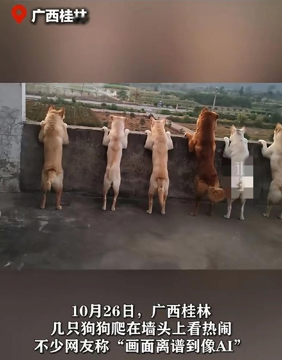 10月26日,广西桂林。一道围墙上,趴着两只狗狗,它们好奇的四处张望。果然是站的高看的远,墙外的景色尽收眼底。下面是一片郁郁葱葱的树林和绿油油的菜地,芬芳馥郁。再往远处是一条公路,来往的车辆川流不息。放眼望去,一座青山云雾缭绕。 两只狗狗被眼前的景色迷住了,久久的不肯离开。别的狗狗见状,也跟着趴在墙上一探究竟,也被吸引住了。狗狗们趴在墙上成一排,组成了吃瓜天团。 到了晚上,外面的景色又换了,漆黑的夜晚,对面的居民楼亮起了一道道灯光,犹如繁星点点。狗狗们趴在墙上,仿佛永远看不够。 这一幕景象使“狗仔队”具象化了,原来它们都有一颗好奇的心。 墙头现狗狗吃瓜天团广西狗狗