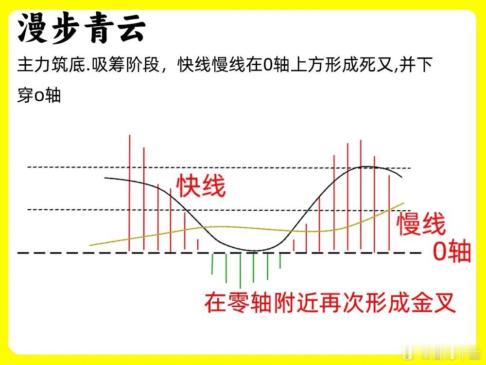股价经过一波上涨以后,开始回调,快慢线在0轴上方形成死叉,之后又在0轴附近形成金叉,快慢线向上发散。往往这种指标走势,出现低位,一般是主力在建仓,抛压基本已经没有,这也是比较经典弱转强形态。这就是是漫步青云形态