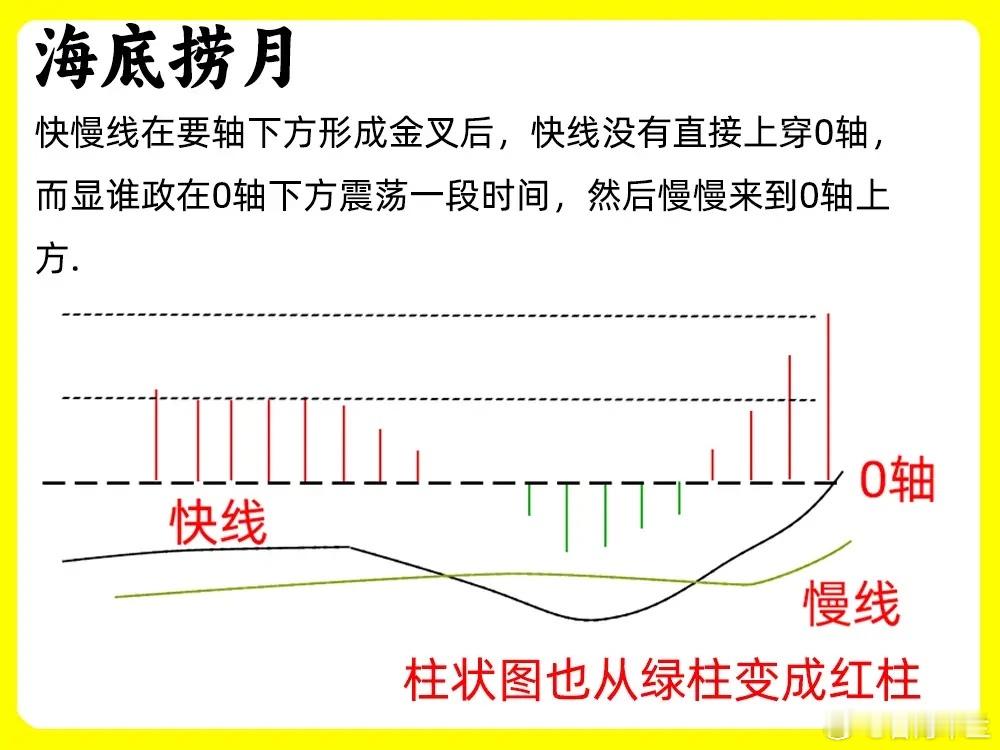 股价在低位开始横盘整理,中期均线也开始走平,MACD指标的快慢线在0轴下方形成两次金叉,慢性在走势比较平缓。快线的第一次金叉,快慢线并没有继续向上突破0轴,而是在0轴下方继续震荡,等到再次金叉的时候,快线突破0轴,在上方运行。这就海底捞月。股价走势平缓,往往是股价在次筑底,有的时候红绿柱也会出现背离的现象。