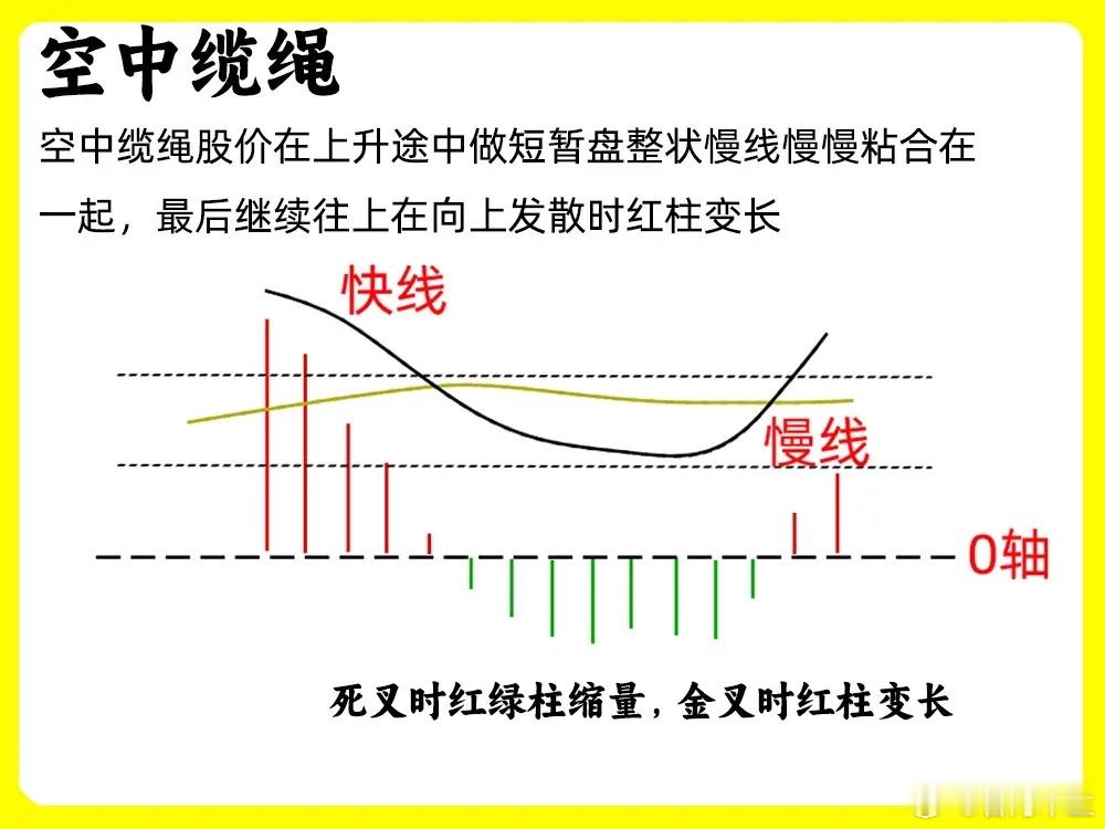 这六种形态,比较有迷惑性,不仔细观察,大脑容易混乱。在0轴下方,快慢线形成金叉,来到0轴上方运行,说明股价开始一波上涨,随后股价开始回调,快线也跟随股价下落,和慢线粘合在一起,说明回调幅度不大,是市场的一个蓄势动作。随后快慢线又再次向上发散,红柱也开始逐步放大,这种形态就空中缆绳。