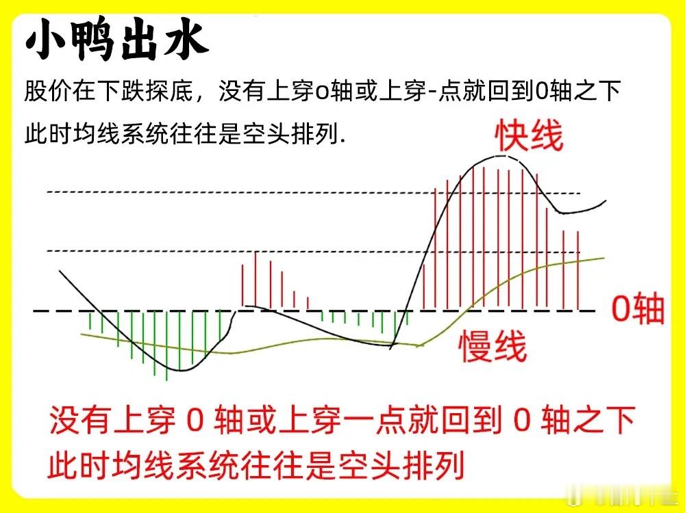 快慢线线在0轴下方出现金叉,但是没有继续突破0轴,而是在水下继续运行,出现死叉,随后再次出现金叉,突破0轴,此时的红柱开始不断变大。整个过程里,快线的波动其实比较小的,说明短期内,出现一个横向震荡的走势。这就是小鸭出水形态