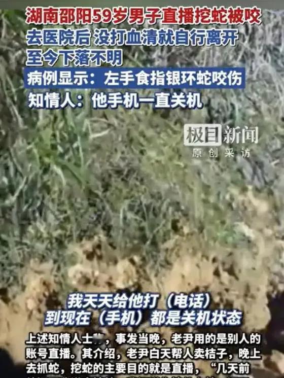 直播间的老铁们看好了,今晚挖条大的!59岁的湖南邵阳老尹对着镜头兴奋吆喝,没想到几分钟后,银环蛇的毒牙直接刺进他手指。更让人揪心的是,他到了医院却因4000多元的血清太贵,咬牙开车冲进夜色,至今音讯全无。 ​一边是直播抓蛇的勇,一边是嫌血清贵的窘​,这种撕裂感正是底层网红的真实生存图鉴。老尹白天卖橘子赚200块,晚上挖蛇博关注,最后却因一场意外陷入要钱还是要命的抉择。救援队已找到他弃置的车辆,但人仍失踪。网友痛心评论,他以前还拍视频教人打血清,轮到自己却输给现实! 若这非炒作,48小时黄金救援期已过,银环蛇毒的神经毒性极强。老尹的遭遇撕开了一个残酷真相。有些人的生存账本里,连命都是明码标价的数字。​