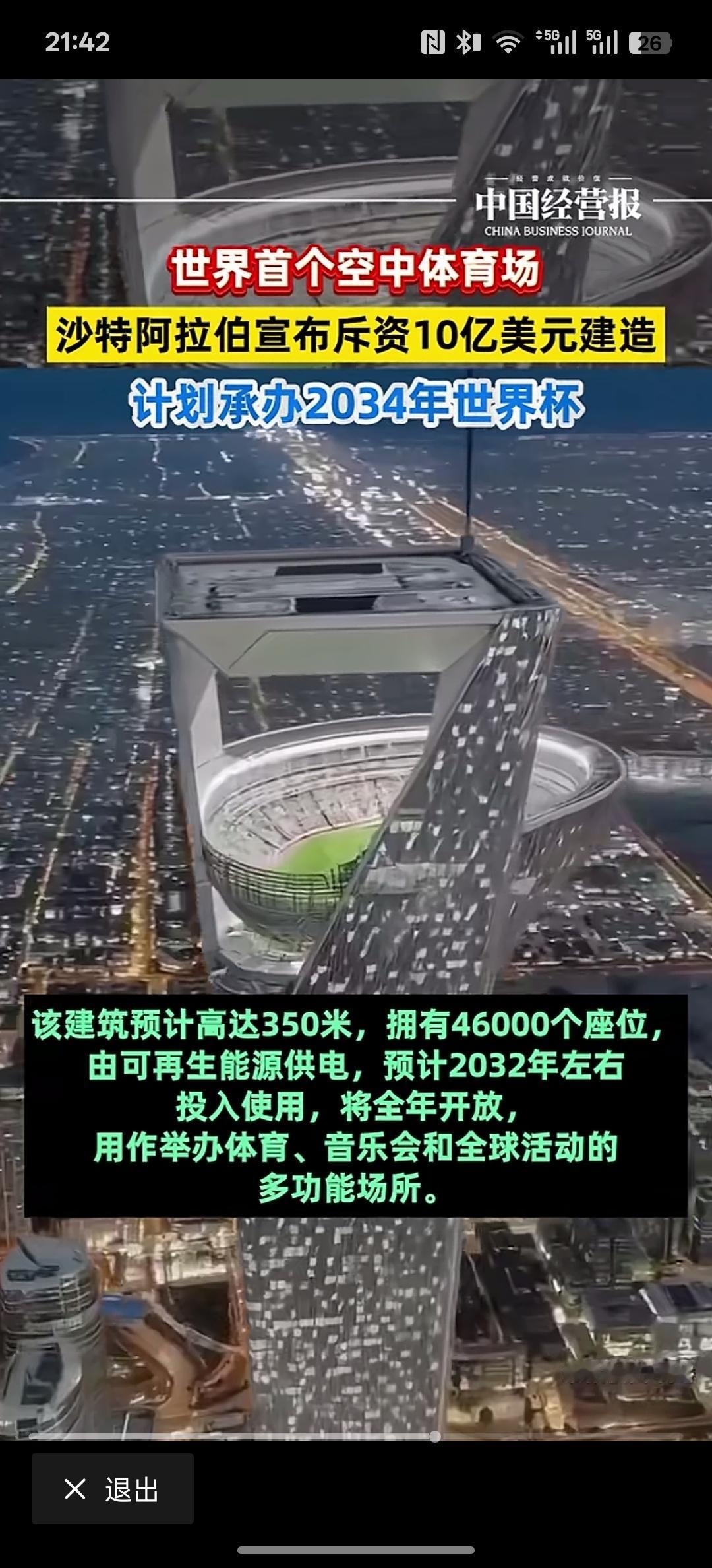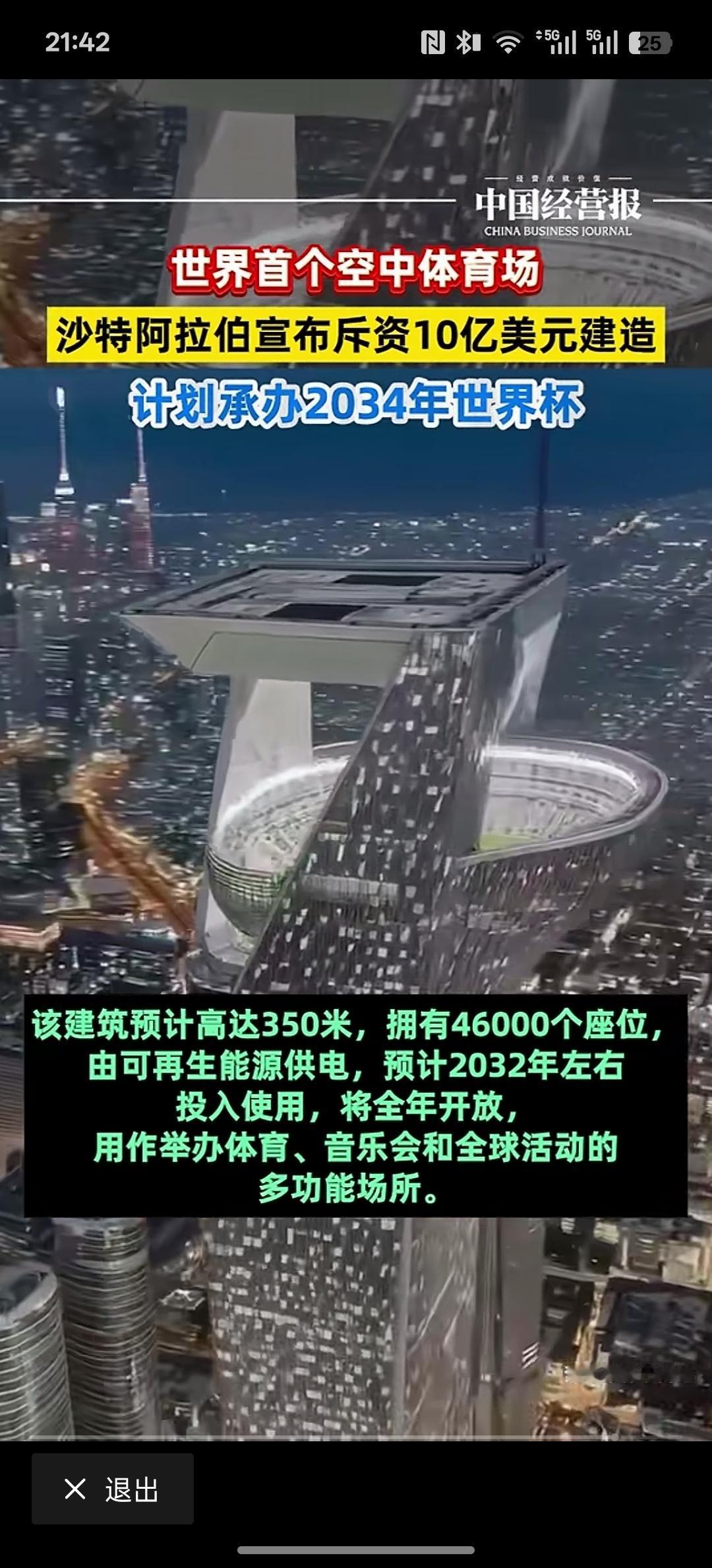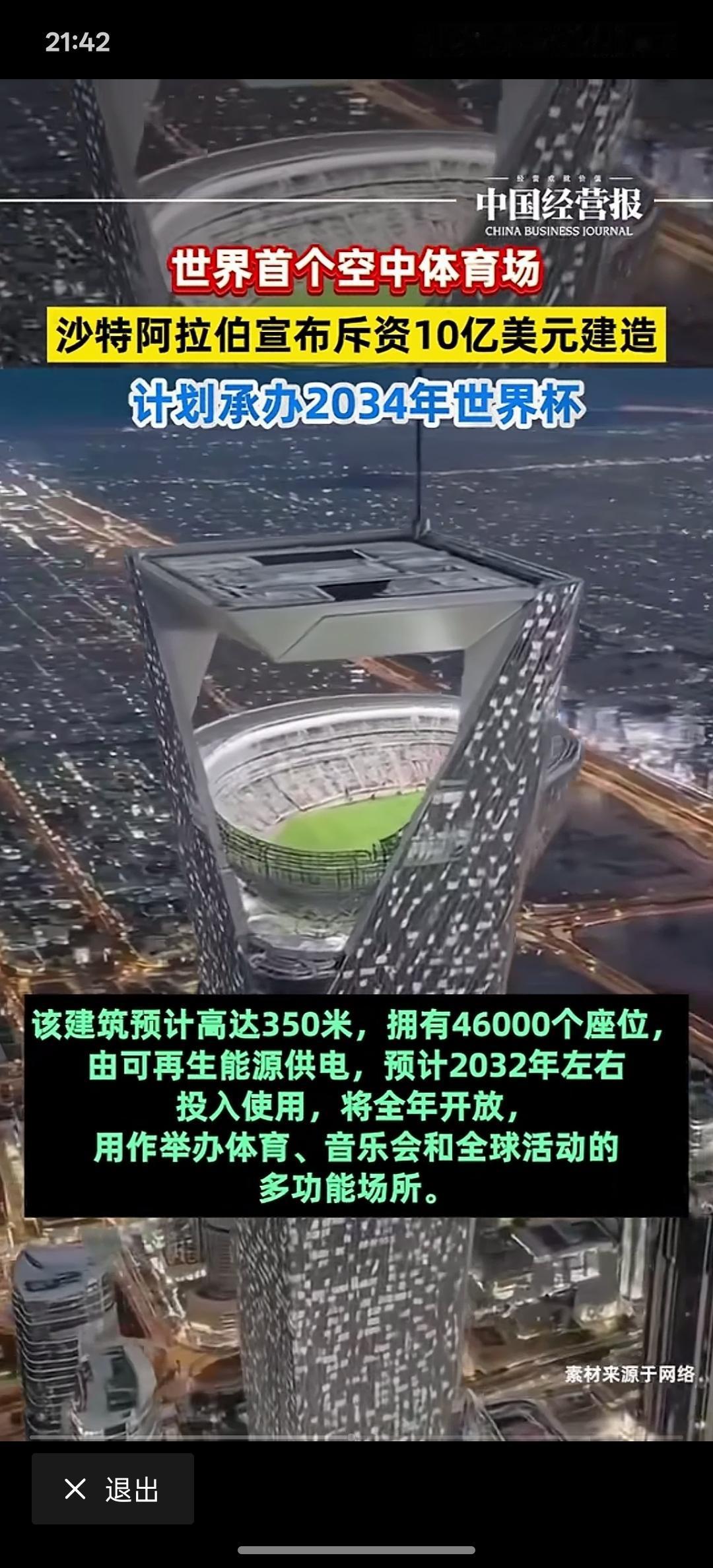 沙特阿拉伯建造世界上首个空中足球场。这样的设计图非常有现代化科技感,而且观景台非常不错,可以看到沙特的全貌风景。在这里观赏踢足球应该票价很高,而且更有欣赏感