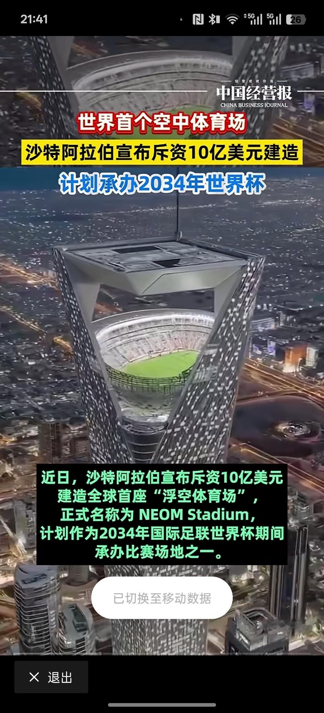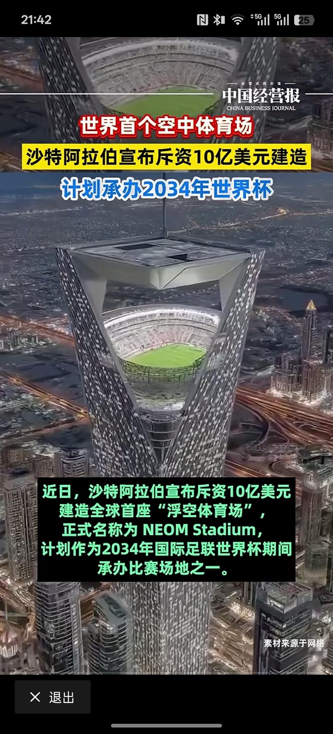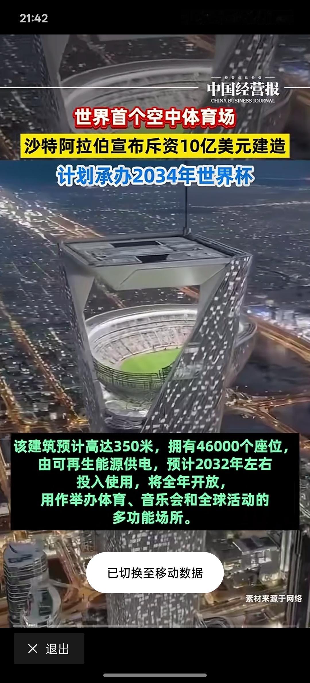 沙特阿拉伯建造世界上首个空中足球场。这样的设计图非常有现代化科技感,而且观景台非常不错,可以看到沙特的全貌风景。在这里观赏踢足球应该票价很高,而且更有欣赏感
